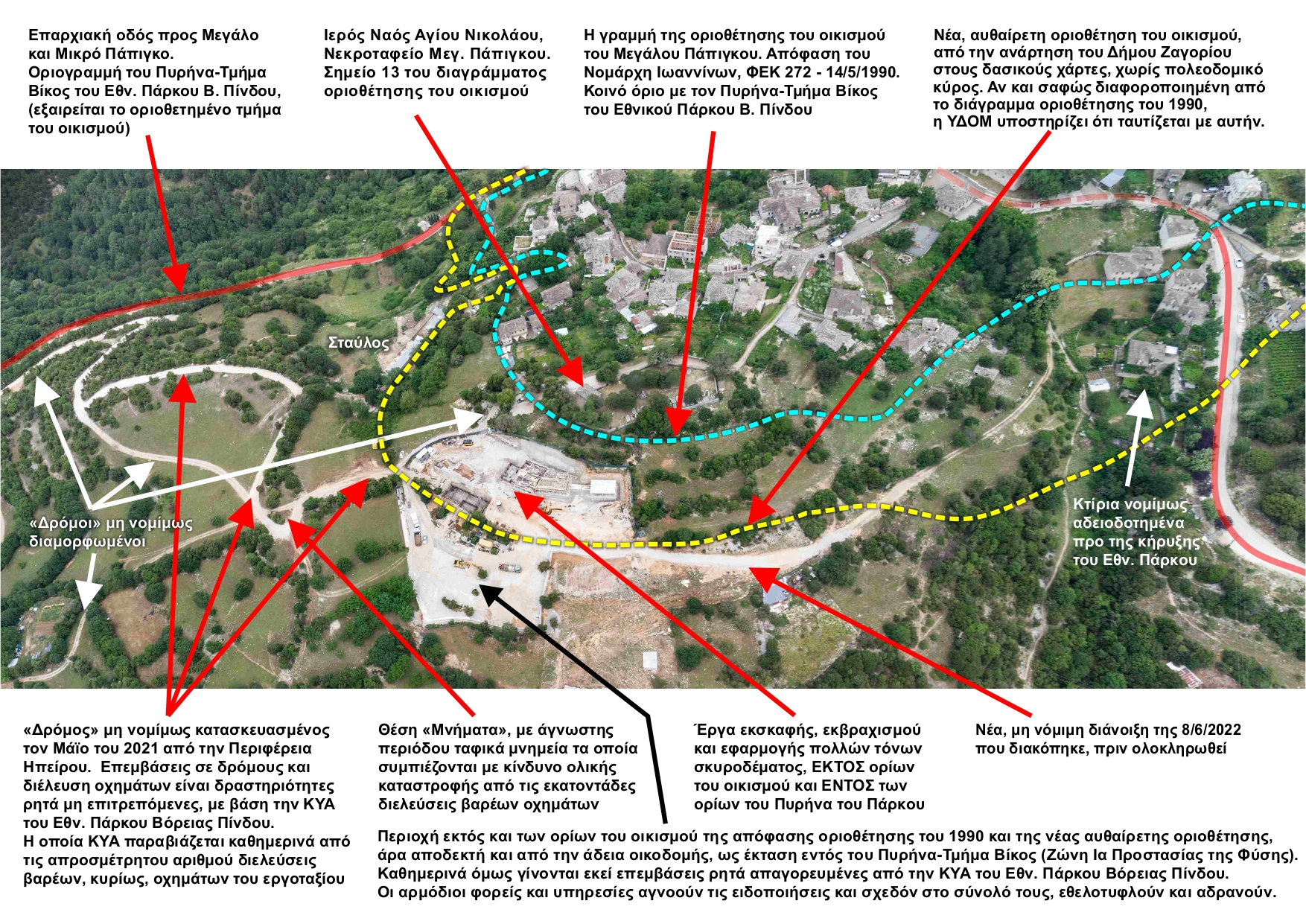 Ο οικισμός του Μεγάλου Πάπιγκου έχει χαρακτηριστεί, όπως και άλλοι οικισμοί, παραδοσιακός, οριοθετήθηκε το 1990 με απόφαση τότε Νομάρχη (ΦΕΚ 272/Δ/14-05-1990), εφάπτεται με τον Πυρήνα του Εθνικού Πάρκου (Τμήμα Βίκος), είναι ενταγμένος όπως όλη η περιοχή στο Δίκτυο Natura 2000, σε δύο μάλιστα ζώνες, ανήκει στο Γεωπάρκο Βίκου-Αώου της UNESCO και είναι εδώ και πολλές δεκαετίες κηρυγμένος Τόπος Ιδιαίτερου Φυσικού Κάλλους και στην Περιφερειακή Ζώνη του Εθνικού Δρυμού με αντίστοιχα Προεδρικά Διατάγματα. Ταυτόχρονα, το Ζαγόρι έχει προσφάτως εγγραφεί στον Κατάλογο των Μνημείων της Παγκόσμιας Κληρονομιάς της UNESCO ως Πολιτιστικό Τοπίο. Όλα αυτά δεν ήταν αρκετά σημαντικά για να εμποδίσουν τη δόμηση η οποία συνεχίζεται απρόσκοπτα και τα δύο σπίτια είναι, σύμφωνα με πληροφορίες, έτοιμα προς κατοίκηση. Ωστόσο δεν πρόκειται μόνο για αυτά, καθώς για την εξυπηρέτηση της δόμησης και της αδειοδότησής της, σύμφωνα με καταγγελίες οργανώσεων, έχουν διανοιχτεί παράνομα δρόμοι ενώ έχουν εκφραστεί ανησυχίες για την καταπάτηση ιστορικών μονοπατιών που αποτελούν πολιτιστικά μνημεία.