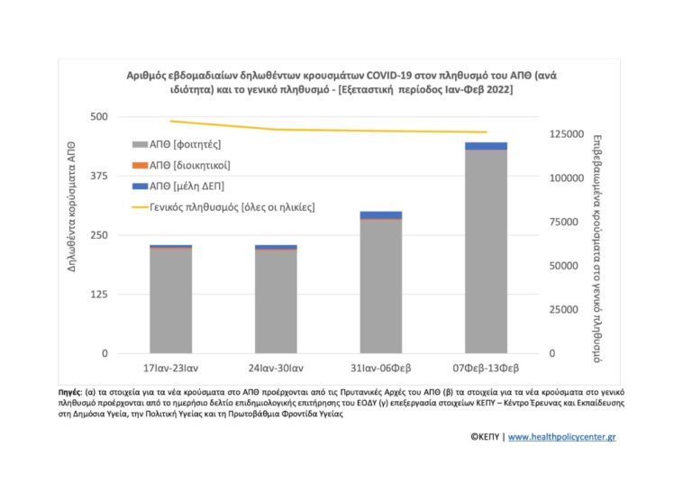 Κατά τις τρεις πρώτες εβδομάδες της εξεταστικής περιόδου (24 Ιανουαρίου έως 13 Φεβρουαρίου) τα εβδομαδιαία δηλωθέντα κρούσματα COVID-19 στις Πρυτανικές Αρχές του ΑΠΘ υπερδιπλασιάστηκαν σε σχέση με την εβδομάδα πριν την έναρξη της εξεταστικής. Κατά την ίδια χρονική περίοδο η διασπορά της επιδημίας στο γενικό πληθυσμό παρέμενε σταθερή, ελαφρά δε αποκλιμακούμενη, αναφέρει το ΚΕΠΥ τονίζοντας πως «η πορεία της επιδημίας στο ΑΠΘ, λόγω του αυξημένου συγχρωτισμού σε εξεταστικές αίθουσες χωρίς πρόσβαση σε φυσικό αερισμό και τήρηση των αναγκαίων αποστάσεων, ακολουθεί αντίστροφη πορεία σε σχέση με αυτή που παρατηρείται προς ώρας στην κοινότητα».