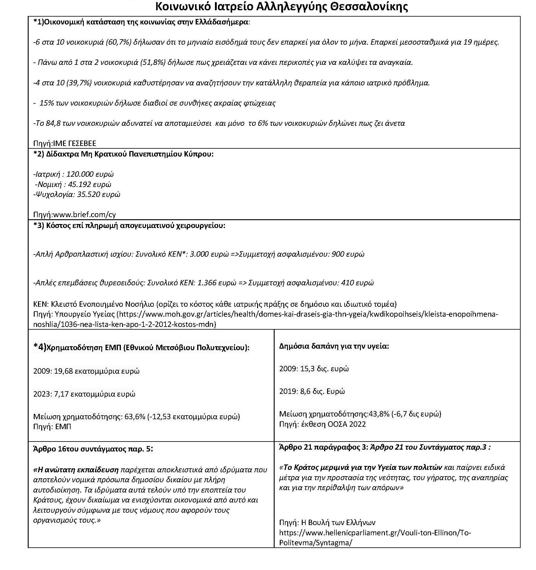 Την ανάγκη ύπαρξης ενός δημόσιου συστήματος υγείας και παιδείας επισημαίνει σε ανακοίνωση του το Κοινωνικό Ιατρείο Αλληλεγγύης Θεσσαλονίκης.”Από την πρώτη στιγμή έχουμε ταχθεί υπέρ ενός Δημόσιου Δωρεάν Συστήματος Υγείας που θα προσφέρει ποιοτική φροντίδα χωρίς καμία διάκριση σε όλους του ανθρώπους και, δεν θα σταματήσουμε να αγωνιζόμαστε γι αυτό. Για μας είναι αυτονόητο ότι στεκόμαστε στο πλευρό όσων οραματίζονται και παλεύουν για Ελεύθερο Δημόσιο Πανεπιστήμιο. Ξέρουμε ότι οι αγώνες μας συνδέονται και αφορούν όλους τους ανθρώπους, όλη την κοινωνία”, τονίζει σε ανακοίνωση του το ΚΙΑ Θεσσαλονίκης.