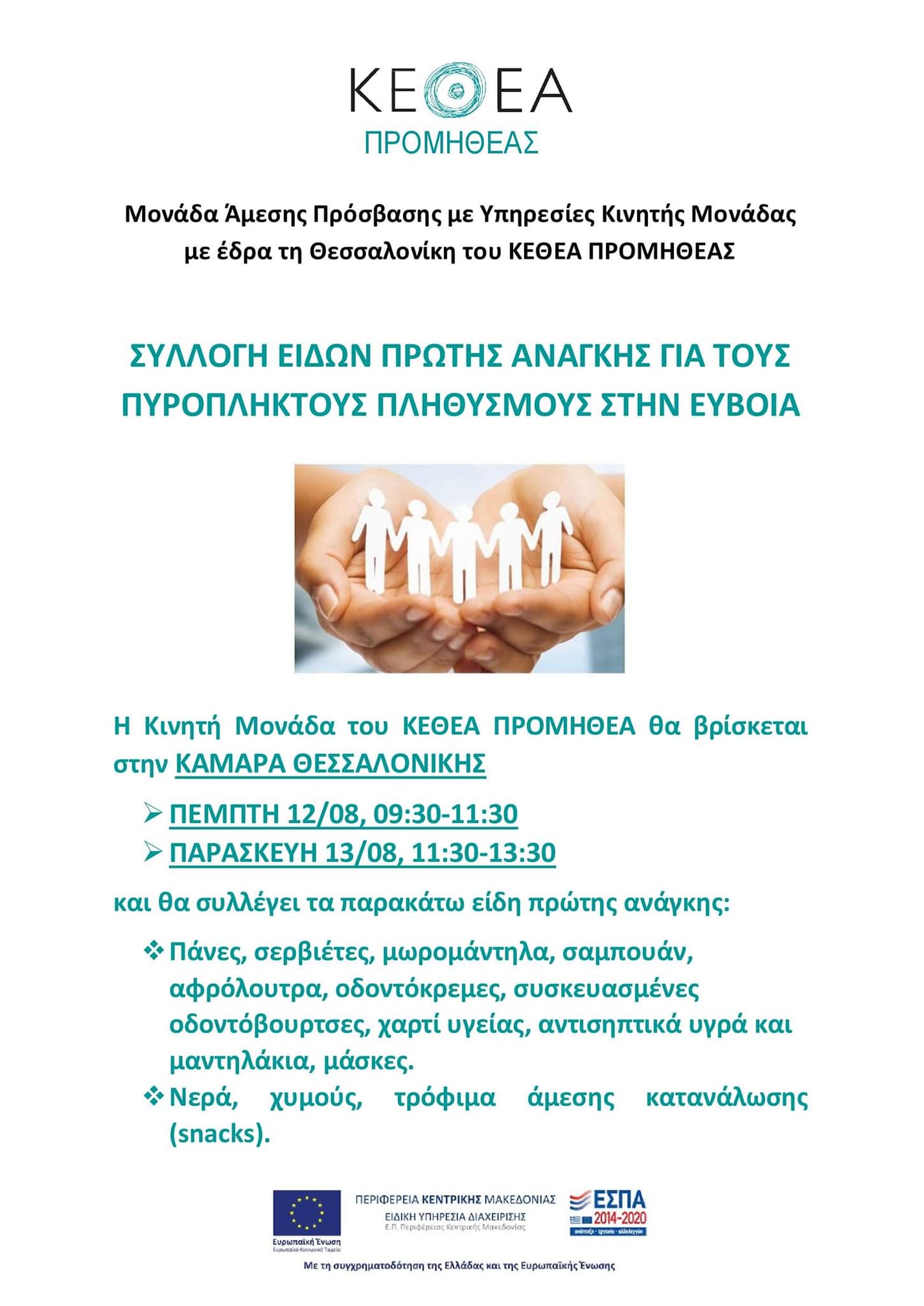 Η Μονάδα Άμεσης Πρόσβασης με Υπηρεσίες Κινητής Μονάδας ΕΣΠΑ, με έδρα τη Θεσσαλονίκη του ΚΕΘΕΑ ΠΡΟΜΗΘΕΑΣ, απευθύνει κάλεσμα έτσι ώστε να συμβάλουμε όλοι μαζί στην φροντίδα των πυρόπληκτων της Εύβοιας, συλλέγοντας είδη πρώτης ανάγκης που θα αποσταλούν στο Δημαρχείο Μαντουδίου, Λίμνης, Αγίας Άννας Ευβοίας, για τη βοήθεια των πυρόπληκτων πληθυσμών, με δωρεάν αποστολή από την ΕΛΤΑ Courier!