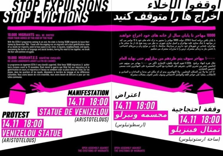 Σε κινητοποίηση ενάντια στις εξώσεις των προσφύγων και των μεταναστ(ρι)ών καλούν η «Ανοιχτή συνέλευση ενάντια στις εξώσεις» και η «Room 39» την Δευτέρα 14 Νοέμβρη στις 18:00 στο άγαλμα Βενιζέλου.