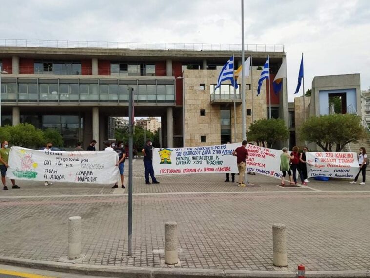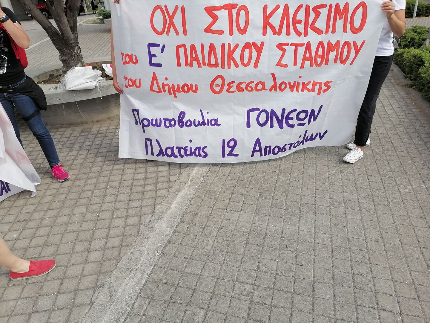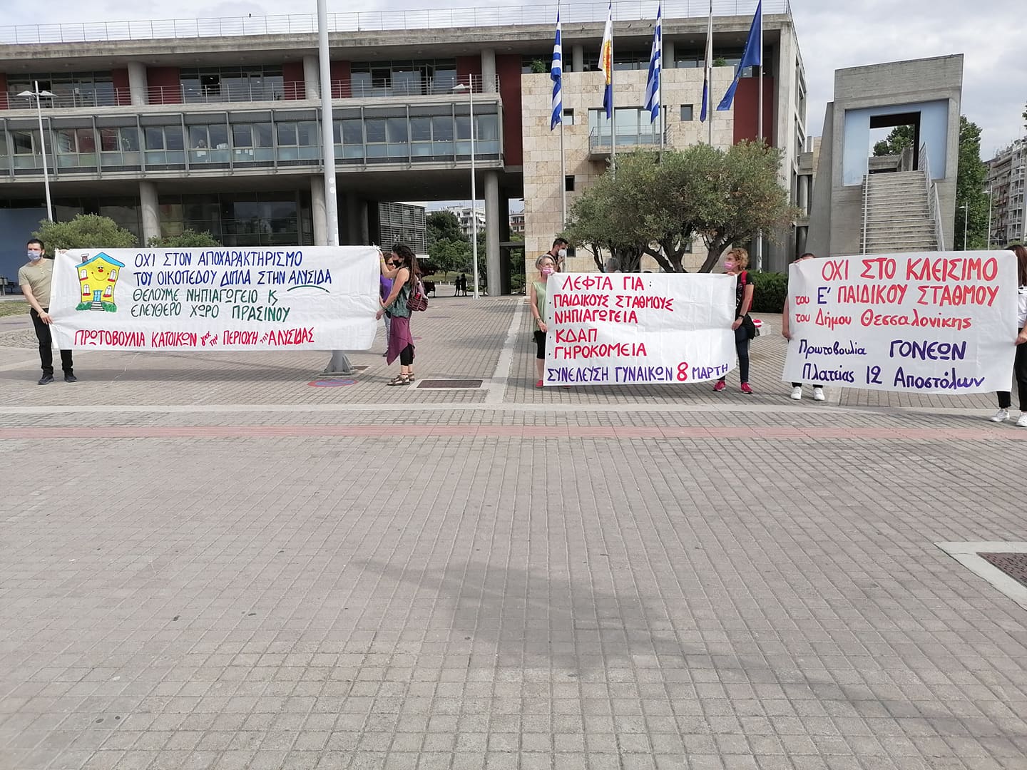 Κινητοποίηση έξω από το Δημαρχείο Θεσσαλονίκης πραγματοποίησαν εχθές, Δευτέρα 7 Ιουνίου, η «Πρωτοβουλία κατοίκων για την περιοχή της Αλυσίδας», τα δημοτικά σχήματα «Η Πόλη Ανάποδα» και «Δύναμη Ανατροπής», η Συνέλευση Γυναικών «8 Μάρτη» αλλά και η «πρωτοβουλία γονέων 12 Αποστόλων» που βρίσκονται επίσης σε κινητοποιήσεις ενόψει του κλεισίματος του Ε΄Βρεφονηπιακού Σταθμού που στεγάζεται στην περιοχή.
