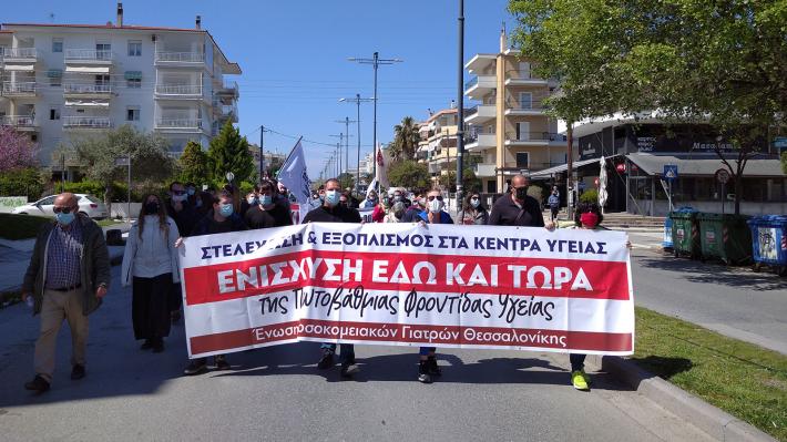«Στελέχωση και εξοπλισμό στα Κέντρα Υγείας, ενίσχυση εδώ και τώρα της Πρωτοβάθμιας Φροντίδας Υγείας» έγραφε το πανό της Ένωσης Νοσοκομειακών Γιατρών Θεσσαλονίκης στην κορυφή της πορείας.