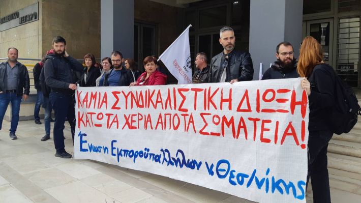 Κινητοποίηση έξω από τα δικαστήρια Θεσσαλονίκης πραγματοποιεί αυτή την ώρα η Ένωση Εμποροϋπαλλήλων Ν. Θεσσαλονίκης ενάντια στο εργοδοτικό ντόμινο συνδικαλιστικών διώξεων καθώς σήμερα εκδικάζεται η μήνυση της εργοδοσίας των σούπερ μάρκετ «Discount» στους εργαζόμενους, επειδή έκαναν το αυτονόητο, δηλαδή να υπερασπιστούν τις δουλειές και τον μισθό των συναδέλφων τους.
