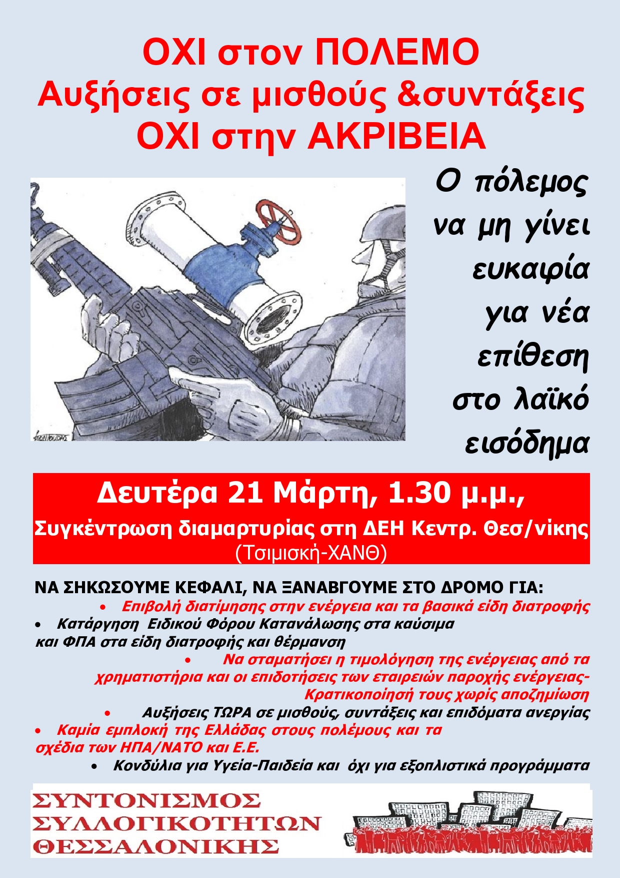 Σε συγκέντρωση ενάντια στον πόλεμο και την ακρίβεια καλεί σήμερα, Δευτέρα 21 Μάρτη στις 13.30, ο Συντονισμός Συλλογικότητων Θεσσαλονίκης, έξω από την ΔΕΗ στην οδό Τσιμισκή στην περιοχή της ΧΑΝΘ σημειώνοντας πως «τα επιδόματα-ψίχουλα που δίνει η κυβέρνηση δεν δίνουν καμιά λύση. Μόνη απάντηση είναι να ξεσηκωθεί ο λαός».