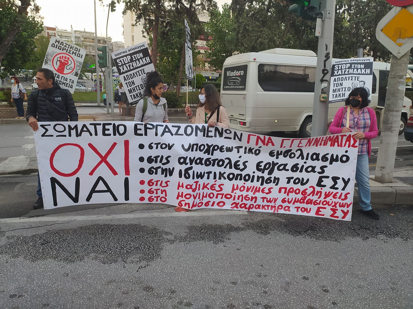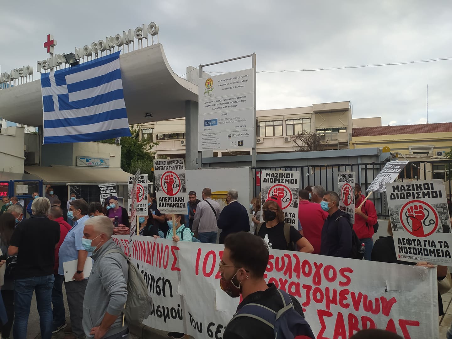 Σε εξέλιξη βρίσκεται η πανελλαδική κινητοποίηση υγειονομικών στο νοσοκομείο στο νοσοκομείο Ιπποκράτειο της Θεσσαλονίκης, με αίτημα την ακύρωση της αναστολής συμβάσεων και την ενίσχυση του δημοσίου συστήματος υγείας. Σε λίγο αναμένεται να ξεκινήσει η πορεία που θα περάσει από νοσοκομεία της πόλης και θα καταλήξει ΥΜΑΘ. «Πλεύρη Μητσοτάκη ακούστε το καλά, όλοι οι εργαζόμενοι θα μείνουν στη δουλειά» είναι ένα από τα συνθήματα που φωνάζουν οι εργαζόμενοι.
