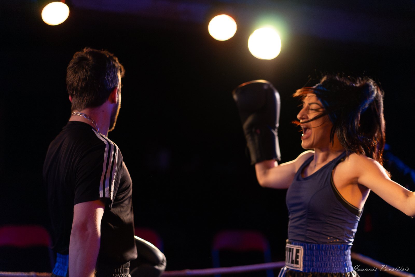 “6 ηθοποιοί, 30 χαρακτήρες και ένα ρινγκ. Ο σκηνικός χώρος μεταμορφώνεται συνυποδηλωτικά σε ένα αυτοσχέδιο ρινγκ μέσα στο οποίο οι ηθοποιοί ενδύονται, πέρα από το θεατρικό «κοστούμι» τους, εκείνο του πυγμάχου. Λαμβάνουν τις συμβολικές μορφές του πυγμάχου ο οποίος είναι υποχρεωμένος να εισαχθεί σε έναν αγώνα, ο οποίος εκκινεί με τη γέννηση και τελειώνει -αυστηρά και μόνο- με τον θάνατο.
