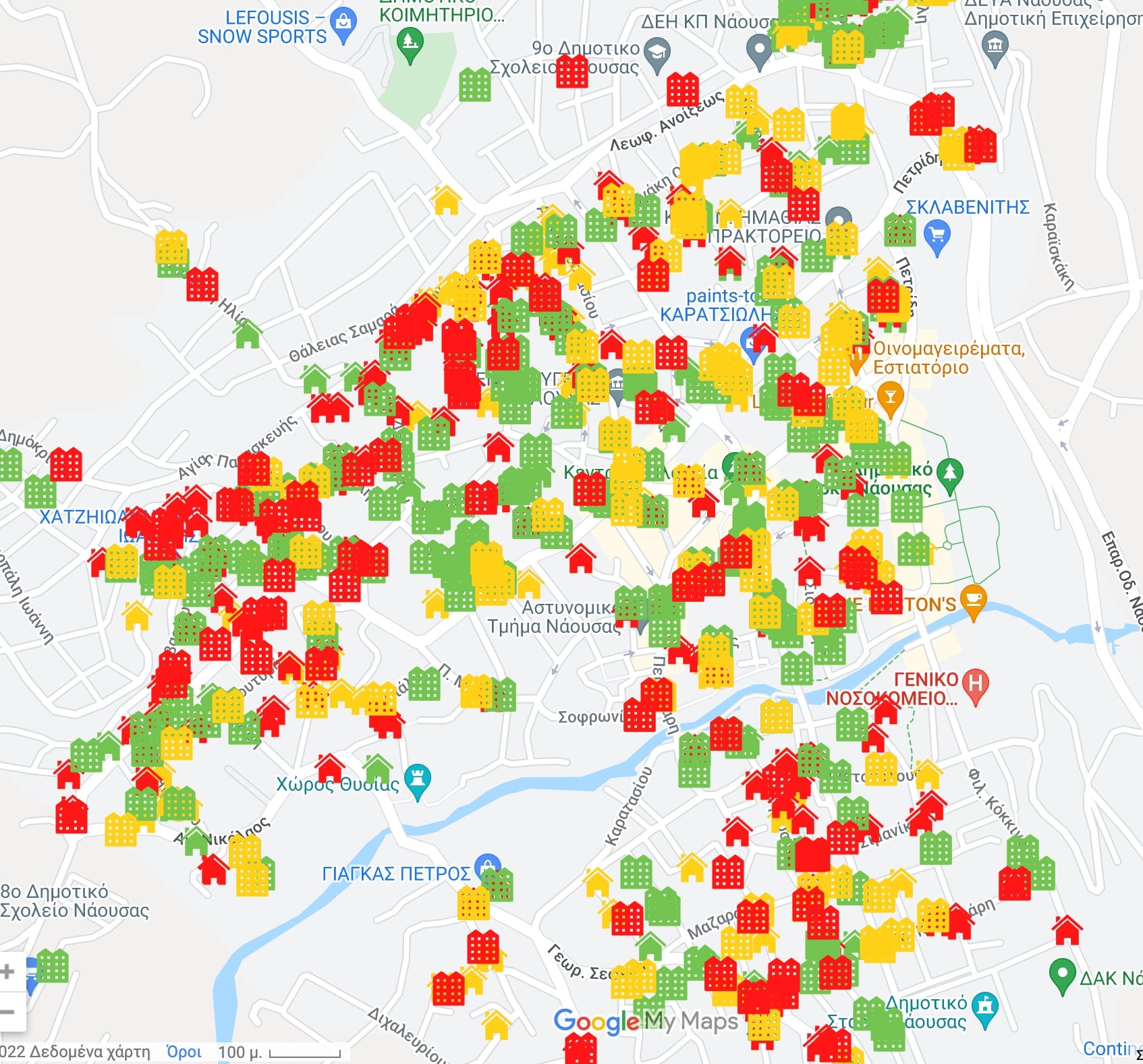 Είπαν όχι. Οπότε το κάναμε μόνοι μας. Ξεκινήσαμε μια ανεξάρτητη πρωτοβουλία χαρτογράφησης. Ο δήμος χωρίστηκε σε δώδεκα τομείς. Κάθε τομέας ανατέθηκε σε ομάδα 1 έως 3 ατόμων. Πήγαμε τετράγωνο το τετράγωνο, πόρτα την πόρτα, ρωτώντας γείτονες, παρατηρώντας ενδείξεις, διασταυρώνοντας, εκτιμώντας για πόσο καιρό τα σπίτια ήταν εκτός χρήσης. Η διαδικασία ήταν αργή. Επίμονη. Βαθιά διαπροσωπική. Απαιτούσε ακρόαση, εμπιστοσύνη, χρόνο. Τα αποτελέσματα ήταν αδιαμφισβήτητα: χιλιάδες άδειες κατοικίες μέσα στα διοικητικά όρια της Νάουσας—χωρίς καν να υπολογίσουμε τα χωριά (εικόνα 1).