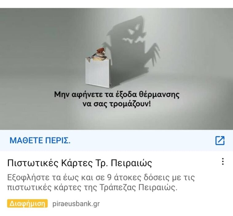 Έτσι, η τράπεζα Πειραιώς έχει προχωρήσει σε νέο πρόγραμμα παροχής πιστωτικών καρτών και έχει γεμίσει το διαδίκτυο με σχετικές διαφημίσεις. Όπως χαρακτηριστικά αναφέρει, «Μην αφήνετε τα έξοδα θέρμανσης να σας τρομάζουν! Εξοφλήστε τα έως τώρα και σε 9 άτοκες δόσεις με τις πιστωτικές κάρτες της Τράπεζας Πειραιώς».