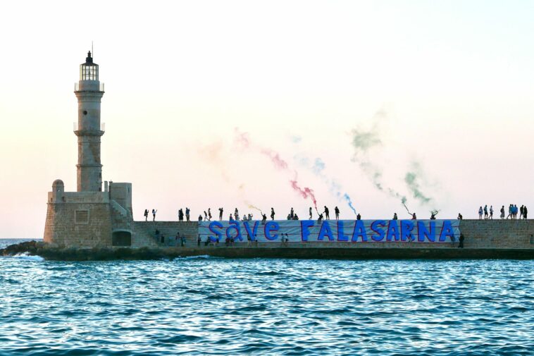Μέλη της πρωτοβουλίας “Save falasarna” ανήρτησαν πανό ζητώντας ελεύθερες παραλίες και διεκδικώντας το σταμάτημα των φαραωνικών «έργων» στις ευαίσθητες περιβαλλοντικά περιοχές .