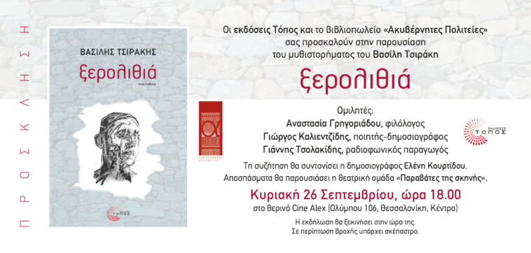 Οι εκδόσεις «Τόπος» και το βιβλιοπωλείο «Ακυβέρνητες Πολιτείες» διοργανώνουν εκδήλωση παρουσίασης του μυθιστορήματος του Βασίλη Τσιράκη «Ξερολιθιά», την Κυριακή 26 Σεπτεμβρίου στις 18.00 στο θερινό cine Alex (Ολύμπου 106).