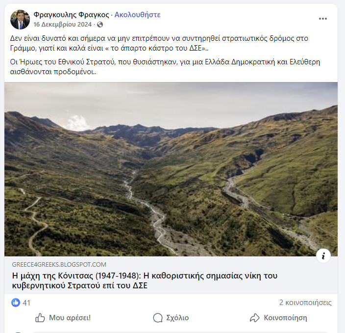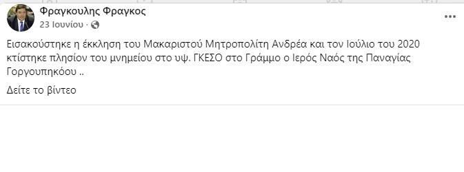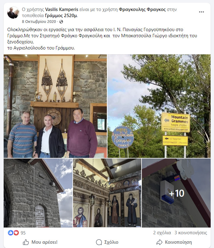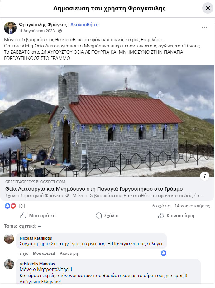 Η ανακοίνωση αναδεικνύει επιπλέον μέσα από βίντεο και φωτογραφίες από τα social media ότι «γνωστός απόστρατος στρατηγός και υποστηρικτής του δρόμου στο Γράμμο με αναρτήσεις του στο διαδίκτυο και τα κοινωνικά δίκτυα δεν κρύβει πώς ότι γίνεται στο Γράμμο είναι η υλοποίηση του σχεδίου που επινόησε ο μακαρίτης μητροπολίτης Κονίτσης Αντρέας (χρηματοδότης της Χρυσής Αυγής σύμφωνα με το Μηχαλολιάκο) που περιλάμβανε την ανέγερση εκκλησίας δίπλα από το μνημείο στο Γκέσο με απώτερο σκοπό την νομιμοποίηση της παρουσίας τους για την αναβίωσης των μνημόσυνων του μίσους παρά και ενάντια στα όσα προβλέπει ο νόμος 1863/1989».