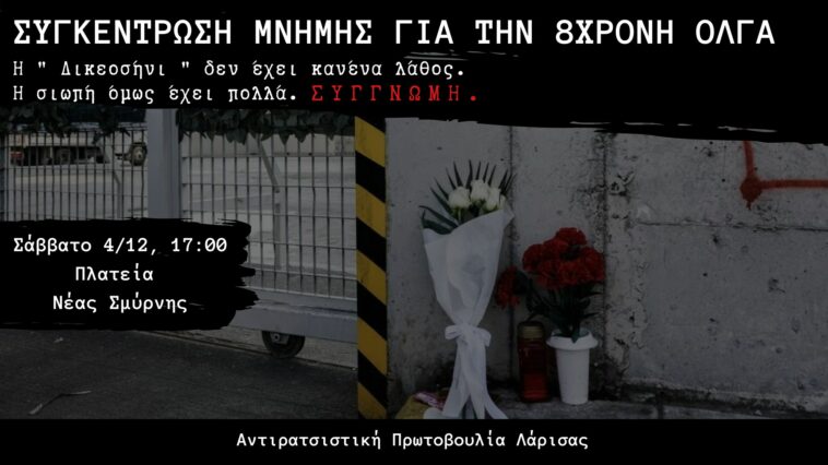 Συγκέντρωση μνήμης για την 8χρονη Όλγα διοργανώνει η Αντιρατσιστική Πρωτοβουλία Λάρισας το Σάββατο 4 Δεκεμβρίου στις 17:00 στην πλατεία Ν. Σμύρνης.