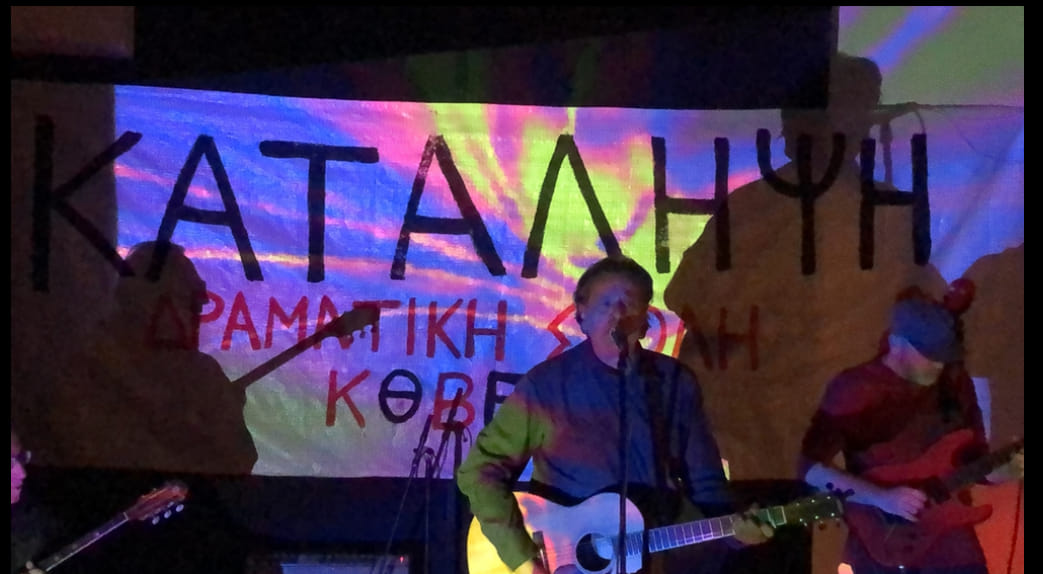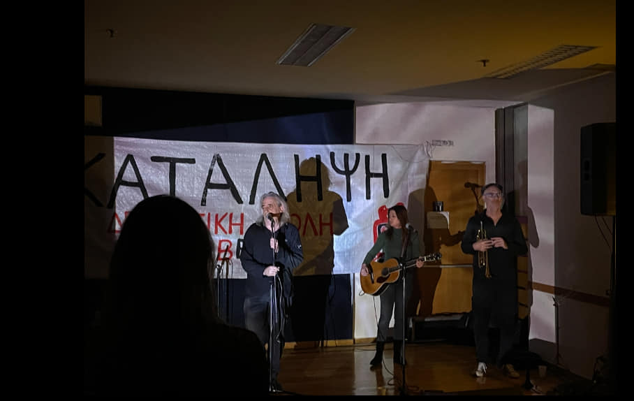 Οι τρεις καλλιτέχνες βρέθηκαν στην Δραματική Σχολή του Κρατικού που βρίσκεται υπό κατάληψη, συνομίλησαν με τους σπουδαστές και τις σπουδάστριες, και τραγούδησαν σε ένδειξη αλληλεγγύης, χωρίς να έχει προηγηθεί κάποια δημόσια ανακοίνωση. Μετά το πέρας της μικρής διάρκειας αλλά μεγάλου συμβολισμού συναυλίας κυκλοφόρησαν στα μέσα κοινωνικής δικτύωσης κάποιες φωτογραφίες από την εκδήλωση.