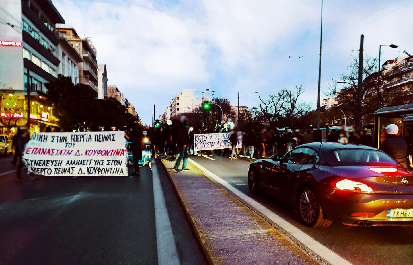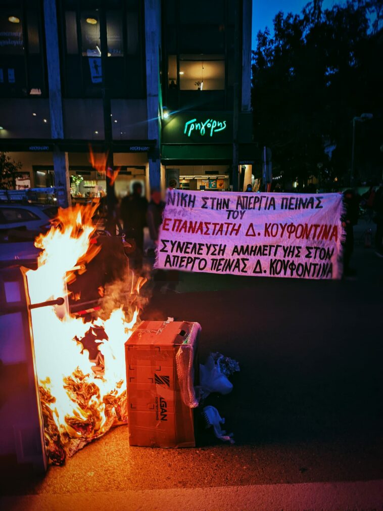 Μαζικές υπήρξαν και οι σημερινές κινητοποιήσεις αλληλεγγύης στον απεργό πείνας Δ. Κουφοντίνα που διανύει την 50η ημέρα απεργίας πείνας, διεκδικώντας την μεταγωγή του στις φυλακές Κορυδαλλού. Νωρίτερα έγινε γνωστό πως ο απεργός πείνας έβγαλε τον ορό όπου δεχόταν αντιβίωση και δήλωσε πως δεν επιθυμεί ανάνηψη σε περίπτωση που χάσει τις αισθήσεις του.