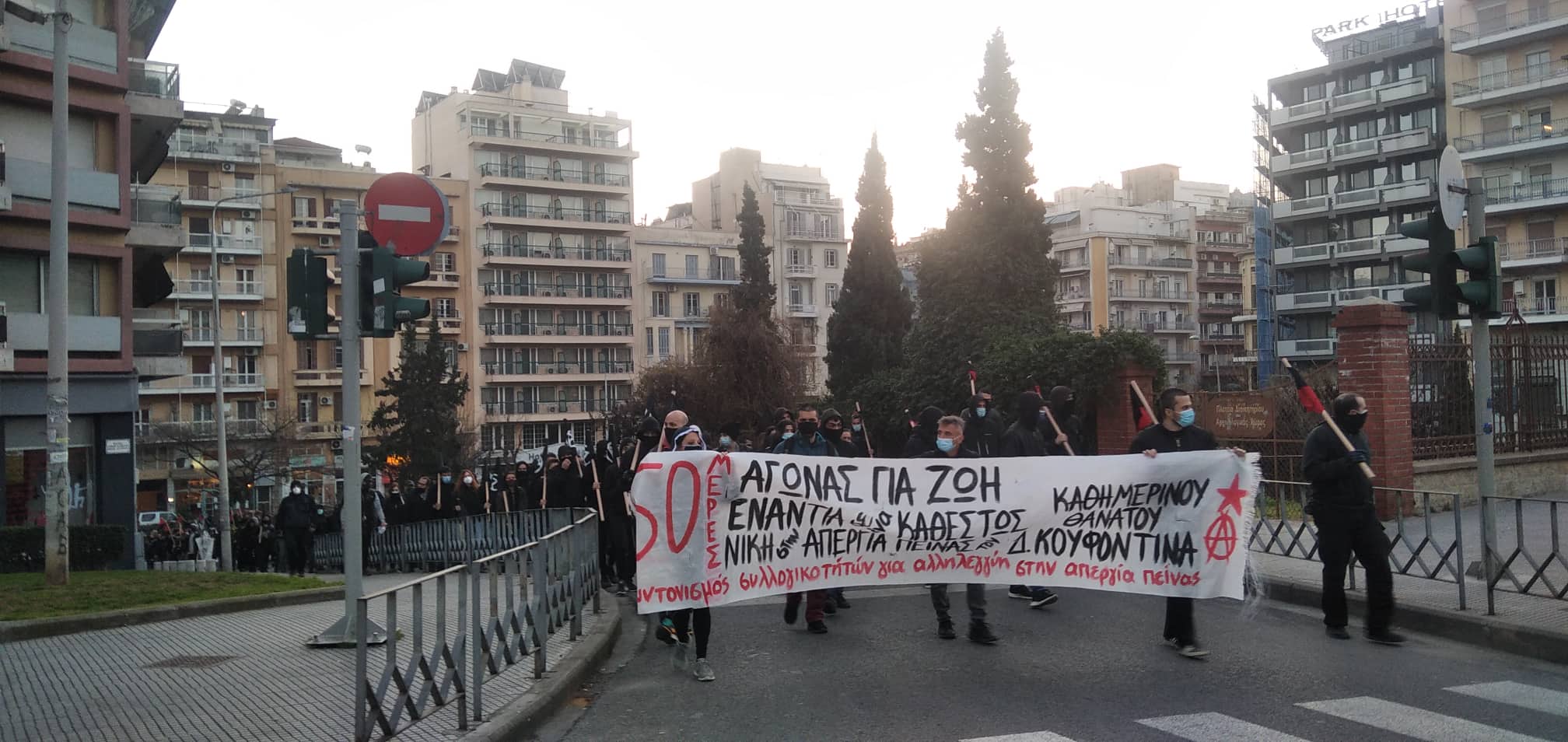 Στη Θεσσαλονίκη, με κεντρικό πανό του συντονισμού συλλογικοτήτων για την υπόθεση που ανέφερε «50 μέρες αγώνας για ζωή ενάντια σε ένα καθεστώς καθημερινού θανάτου», 600 αλληλέγγυοι και αλληλέγγυες διαδήλωσαν στο κέντρο της πόλης, φωνάζοντας συνθήματα ενάντια στην κρατική καταστολή και για την υπεράσπιση της ζωής του απεργού πείνας.