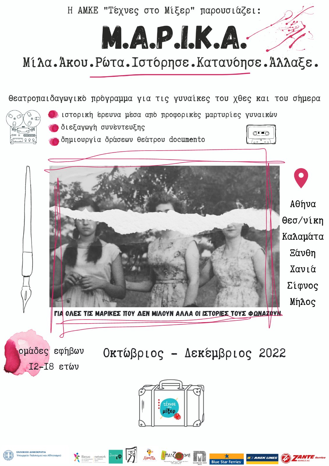 Η ιστορία αυτής της γυναίκας, καταγεγραμμένη με την μέθοδο της συνέντευξης, χρησιμοποιείται ως αφόρμηση για το κοινό θεατροπαιδαγωγικό πρόγραμμα με το οποίο ξεκινούν οι θεατροπαιδαγωγικές συναντήσεις με τις ομάδες. Σκοπός μας είναι να διεξάγουμε μαζί με τις ομάδες εφήβων συνεντεύξεις και να αντλήσουμε νέες, πραγματικές μαρτυρίες γυναικών διαφορετικών περιοχών της Ελλάδας, σε διαφορετικές δεκαετίες, ξεκινώντας από την δεκαετία του ‘40 φτάνοντας στο 2022, θέλοντας να εντοπίσουμε, να ρωτήσουμε, να ακούσουμε, να κατανοήσουμε κι “άλλες Μαρίκες”, να δώσουμε μία φωνή για κάθε «Μαρίκα» που δεν τόλμησε να βγάλει· γιατί οι «Μαρίκες» δεν μιλούν, όμως οι ιστορίες τους ξεκουφαίνουν.