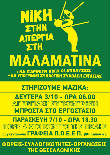 Στον τρίτο μήνα απεργιακών κινητοποιήσεων βρίσκονται πλέον οι εργαζόμενοι στο εργοστάσιο της «Μαλαματίνα» στο Καλοχώρι της Θεσσαλονίκης. Δεν ζητούν κάτι παραπάνω από το ανακληθούν οι απολύσεις τις οποίες πραγματοποιεί η εργοδοσία τους τελευταίους μήνες, στέλνοντας -μέχρι στιγμής- 17 ανθρώπους ακόμα στις ουρές που σχηματίζουν οι περίπου 1.000.000 άνεργοι της χώρας.