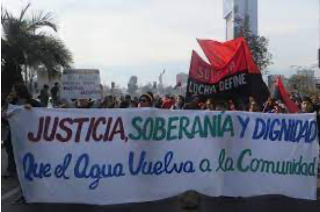 Η Χιλή εκτός από ένα εργαστήριο νεοφιλελεύθερης ανάπτυξης αποτελεί και το εργαστήριο της κλιματικής αλλαγής. Οι εξορυκτικές εταιρείες και γενικότερα το εξορυκτικό μοντέλο, από κοινού με τις φυτείες ευκάλυπτου και πεύκου, είναι υπεύθυνα για την περιβαλλοντική καταστροφή στη χώρα. Ο «Κώδικας του Νερού» που εφαρμόστηκε εν μέσω της δικτατορίας είναι αυτός που ορίζει ότι όχι μόνο η διαχείριση του νερού αλλά και το ίδιο το νερό είναι ιδιωτικοποιημένα. Ο Κώδικας αυτός μετατρέπει τα πάντα στη φύση σε εμπόρευμα και έχει προκαλέσει τεράστιες περιβαλλοντικές αδικίες και συγκρούσεις. Έλεγαν στον κόσμο ότι με μια καλή διαχείριση θα μπορεί να βγάζει νερό εκεί που δεν υπήρχε, ωστόσο το αποτέλεσμα είναι παρατεταμένες κρίσεις λειψυδρίας. Η απάντηση στις κρίσεις αυτές ήταν η πολιτική αύξησης της προσφοράς μέσω της αφαλάτωσης που παρουσιάστηκε ως βιώσιμη και πράσινη ανάπτυξη, χωρίς να τίθενται ερωτήματα και προβληματισμοί γύρω από το εξορυκτικό μοντέλο που καταστρέφει τις πηγές νερού. Οι εξορύξεις και η εκτεταμένη γεωργία δεν αντιμετωπίζουν πρόβλημα με το νερό γιατί είναι αυτές που το εκμεταλλεύονται, ωστόσο οι ανθρώπινες ανάγκες σε νερό αντιμετωπίζονται ως δευτερεύουσες και η ευθύνη ρίχνεται στους πολίτες. Στις αγροτικές περιοχές για να πιουν νερό φέρνουν βυτία, ενώ στις Άνδεις το νερό δεσμεύεται για τις εξορύξεις και πίνουν αφαλατωμένο που το πληρώνουν ακριβά. Ο κόσμος προτιμάει στις πόλεις να πίνει εμφιαλωμένο αν και το θεωρεί επισφαλές, ενώ στις αγροτικές περιοχές είχε μπει όριο στη διάρκεια της πανδημίας στα πενήντα λίτρα ανά άτομο την ημέρα. Οι περισσότεροι αγώνες εκεί αφορούν την αύξηση αυτής της ποσότητας για κατανάλωση. Ενδεικτικό είναι ότι σε εφτά πόλεις, 650.000 κάτοικοι, τροφοδοτούνται μόνο με αφαλατωμένο νερό. Πριν από έναν χρόνο υπήρξε η απειλή ότι θα κοπεί το νερό και στο Σαντιάγο. Η λειψυδρία είναι ένα πολιτικό και όχι «φυσικό» πρόβλημα, και για τον λόγο αυτό στην εξέγερση καταγράφηκαν αιτήματα με σχετικά συνθήματα σε δρόμους και τοίχους, γιατί ζούμε σε μια χώρα που μας στερεί ένα θεμελιώδες δικαίωμα. Είχαμε έτσι συνθήματα με αίτημα να «ανακτηθεί το κλεμμένο νερό» και «ελεύθερα ποτάμια», άλλα που έλεγαν ότι «το νερό τελειώνει επειδή το κλέβουν», «δεν είναι ξηρασία, είναι λεηλασία» και πολλά που αφορούσαν την κρατικοποίηση της διαχείρισής του.