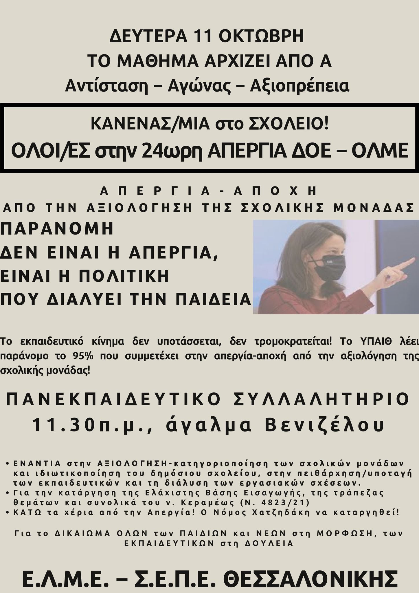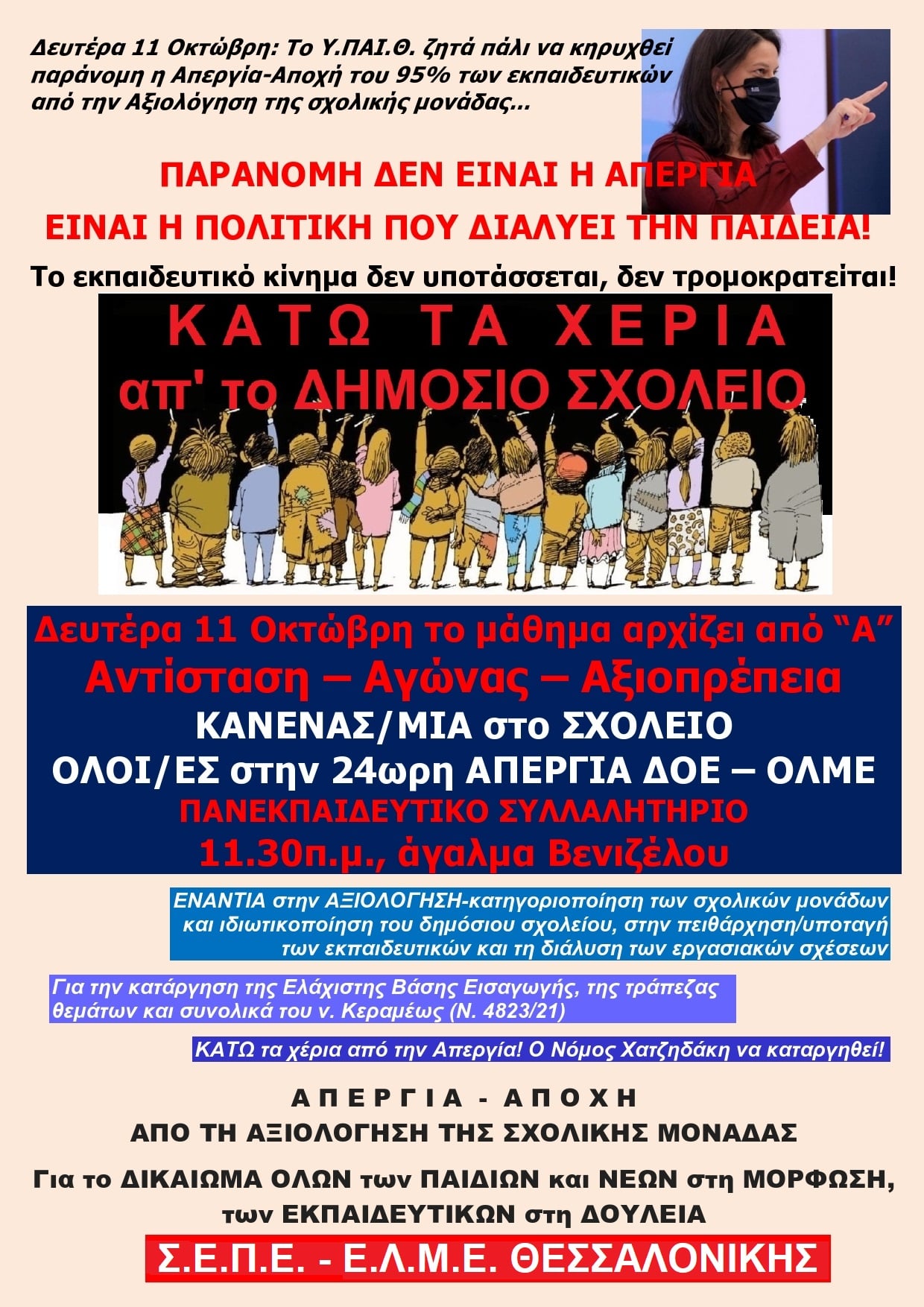 «Κόντρα και ενάντια στην εκφρασμένη άρνηση της αξιολόγησης της σχολικής μονάδας από τη συντριπτική πλειοψηφία των εκπαιδευτικών πρωτοβάθμιας και δευτεροβάθμιας εκπαίδευσης, το υπουργείο κατέθεσε στις 7/10/21 αντέφεση στην έφεση που είχαν καταθέσει οι εκπαιδευτικές ομοσπονδίες στις 4/10/21 (είχαν πάρει ημερομηνία εκδίκασης 25/1/22, ενώ το υπουργείο πήρε ημερομηνία εκδίκασης στις 11/10/21) κατά της προηγούμενης δικαστικής απόφασης που έκρινε την απεργία-αποχή των ΔΟΕ-ΟΛΜΕ-ΟΙΕΛΕ- για την αξιολόγηση της σχολικής μονάδας παράνομη. Η έφεση του υπουργείου ζητά να κριθεί και καταχρηστική και άμεσα εκτελεστή. Επιπλέον κατέφυγε άμεσα στις 8/10 ενάντια στην απεργία –αποχή από τις διαδικασίες της αξιολόγησης της σχολικής μονάδας που είχε προκηρύξει η ΑΔΕΔΥ για τους εκπαιδευτικούς πετυχαίνοντας, την ίδια μέρα κιόλας, αυτήν τη φορά η απόφαση του δικαστηρίου να κρίνει την απεργία- αποχή όχι μόνο παράνομη αλλά και καταχρηστική, άμεσα εκτελεστή, ενώ προβλέπει ποινή 3.000 ευρώ για κάθε παράβασή της!!! Ο νόμος Χατζηδάκη χρησιμοποιήθηκε για να χτυπηθεί η απεργία των εκπαιδευτικών.