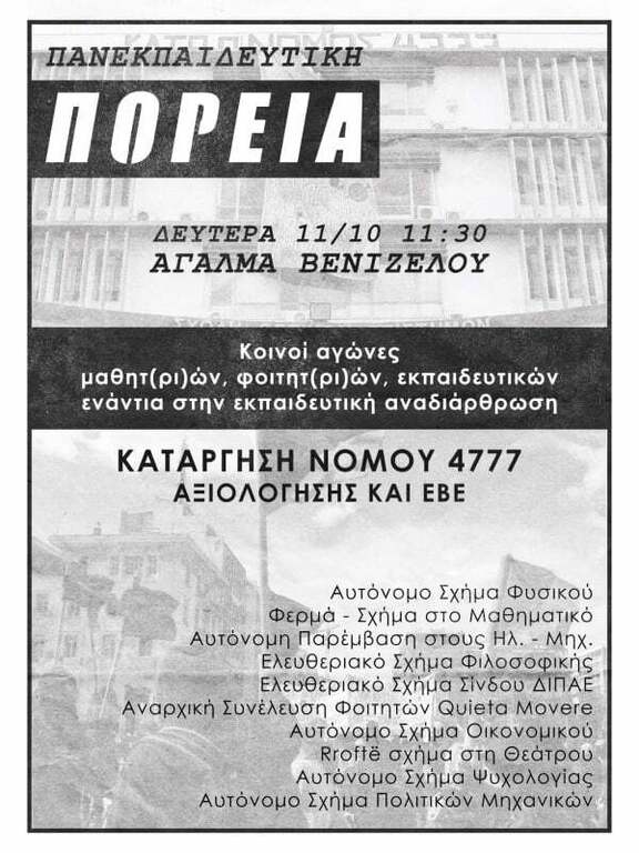 Στις αυριανές κινητοποιήσεις αναμένεται να συμμετέχουν και χιλιάδες μαθητές σχολείων που βιώνουν το οριακό σημείο στο οποίο βρίσκεται η Παιδεία, ενώ ήδη δεκάδες σχολικά κτίρια βρίσκονται υπό κατάληψη σε όλη την χώρα.