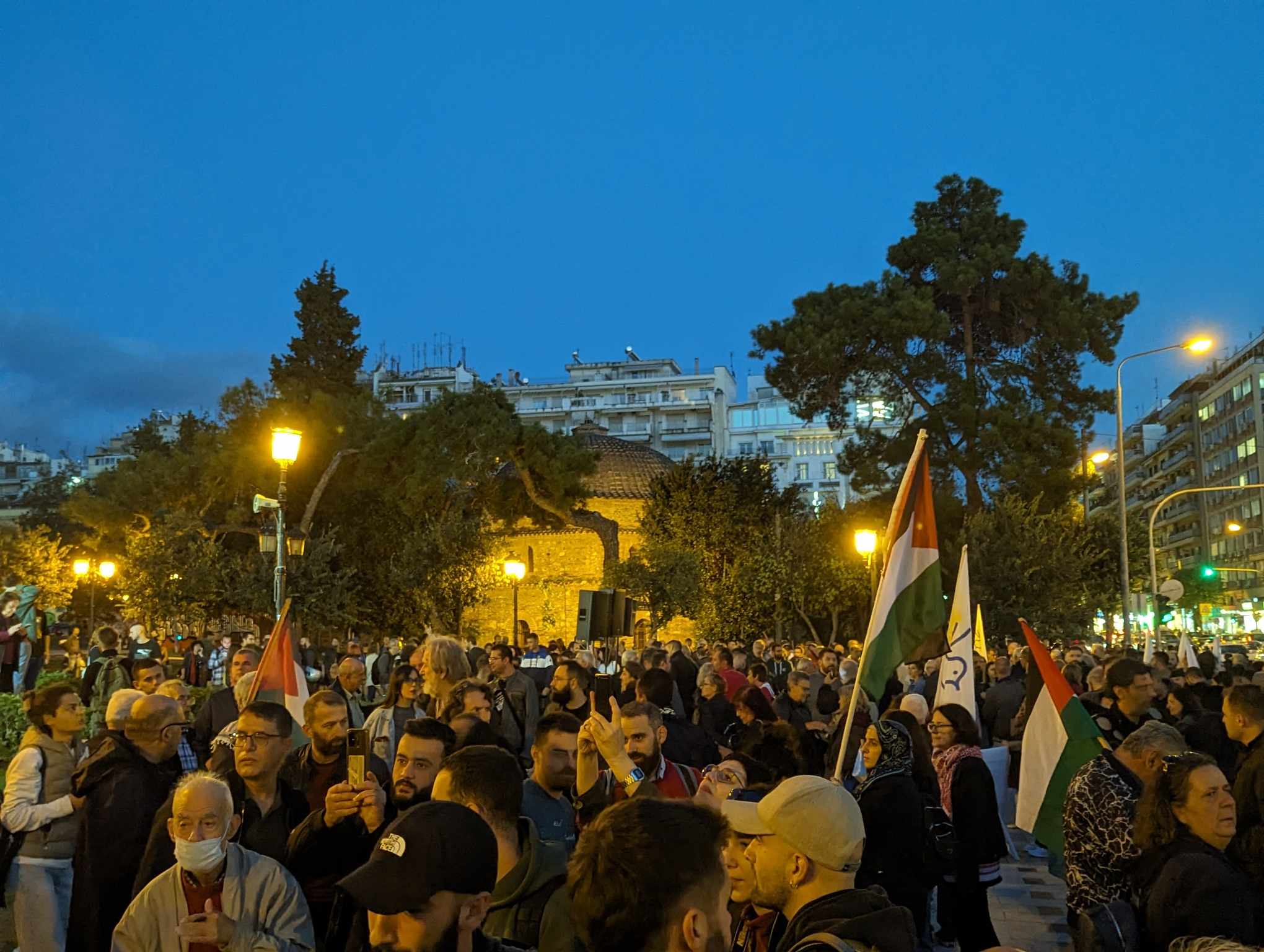 Μαζική πορεία αλληλεγγύης στον λαό της Παλαιστίνης πραγματοποιήθηκε το απόγευμα της Πέμπτης στη Θεσσαλονίκη με τη συμμετοχή πολιτικών και κοινωνικών οργανώσεων της πόλης. Οι δύο συγκεντρώσεις πραγματοποιήθηκαν στο πέταλο της Αριστοτέλους από οργανώσεις της αριστεράς και στο Άγαλμα Βενιζέλου από δυνάμεις του ΚΚΕ και στη συνέχεια πραγματοποιήθηκε κοινή πορεία σε κεντρικούς δρόμους.