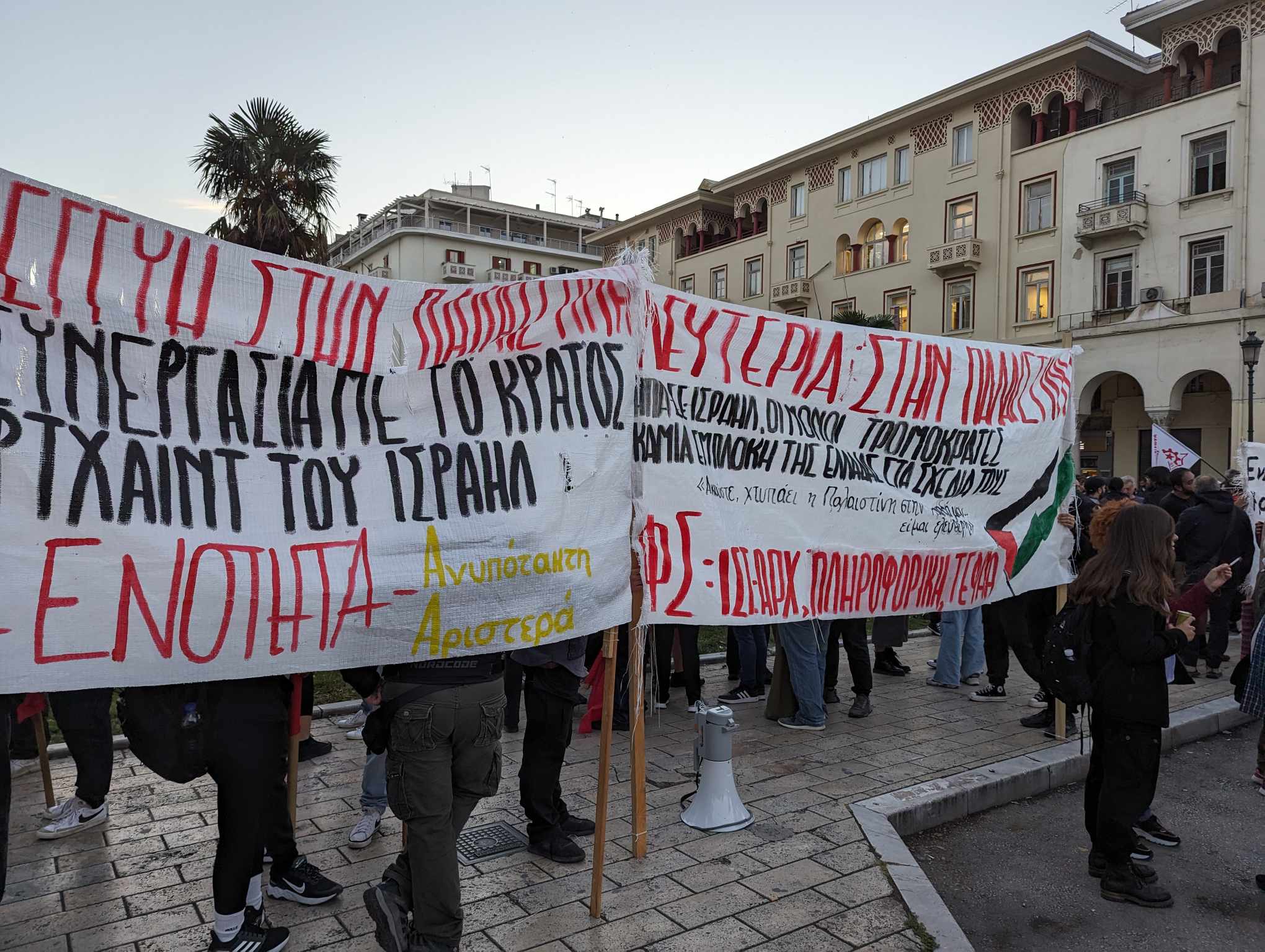 Μαζική πορεία αλληλεγγύης στον λαό της Παλαιστίνης πραγματοποιήθηκε το απόγευμα της Πέμπτης στη Θεσσαλονίκη με τη συμμετοχή πολιτικών και κοινωνικών οργανώσεων της πόλης. Οι δύο συγκεντρώσεις πραγματοποιήθηκαν στο πέταλο της Αριστοτέλους από οργανώσεις της αριστεράς και στο Άγαλμα Βενιζέλου από δυνάμεις του ΚΚΕ και στη συνέχεια πραγματοποιήθηκε κοινή πορεία σε κεντρικούς δρόμους.