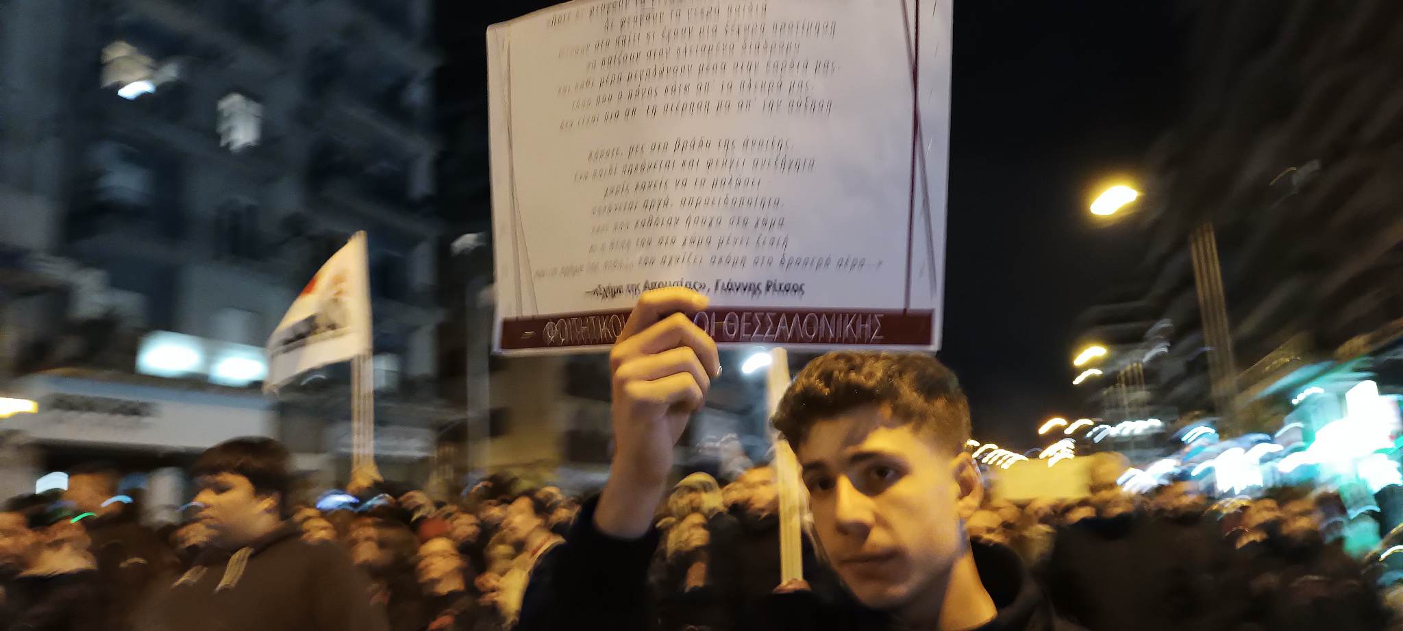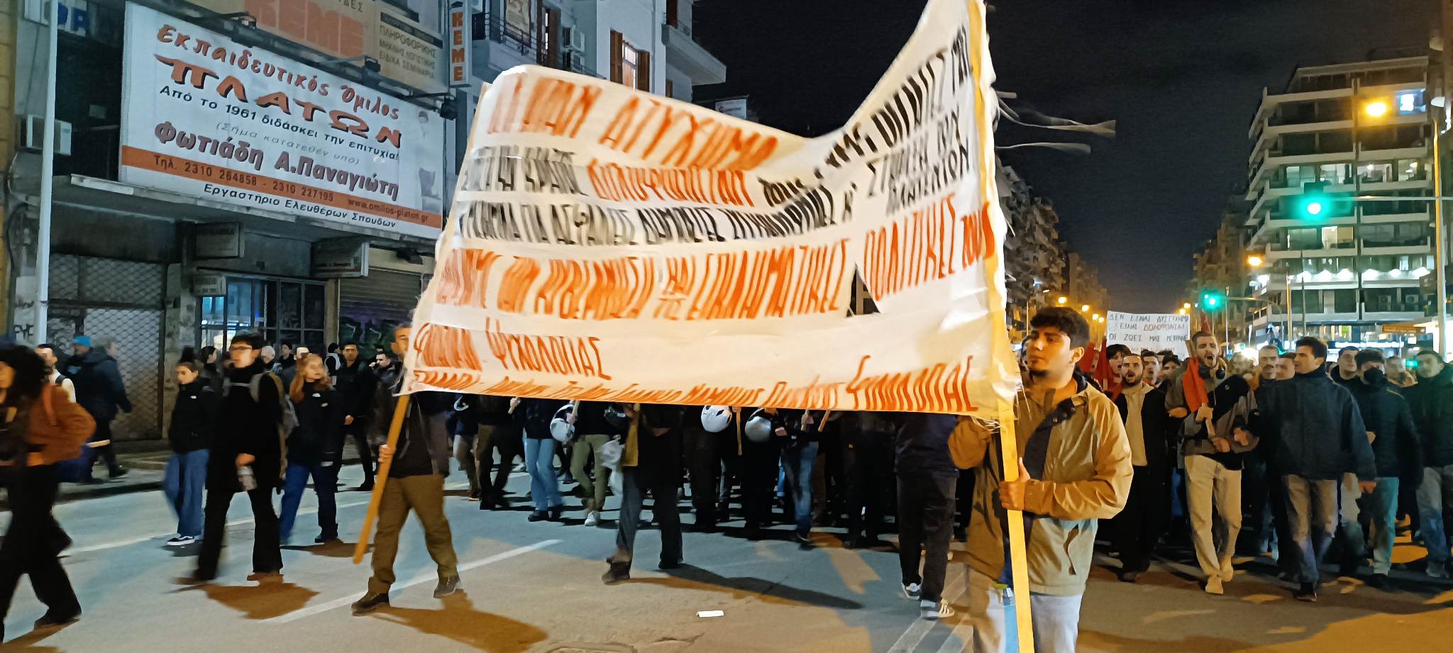 Στη κεφαλή της πορείας, η οποία στην έναρξη της δέχθηκε επίθεση από τα ΜΑΤ με κρότου λάμψης και δακρυγόνα, βρίσκονταν τα πανό των Φοιτητικών Συλλόγων, τα μέλη των οποίων θρηνούν 10 συμφοιτητές τους. Ακολούθησαν τα πανό των πολιτικών και κοινωνικών οργανώσεων της Θεσσαλονίκης.