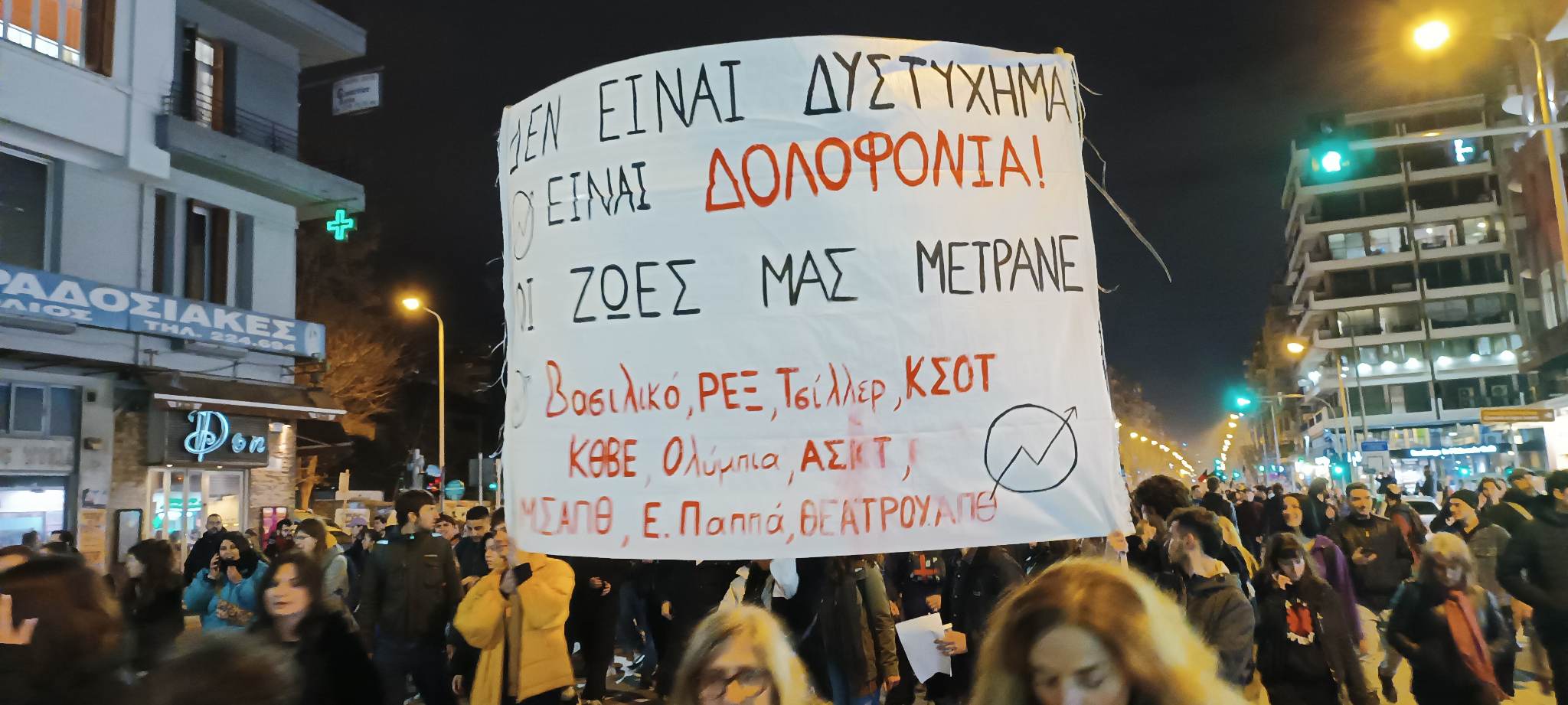 Στη Θεσσαλονίκη περισσότεροι από 5.000 πολίτες συγκεντρώθηκαν στην πλατεία της Καμάρας και προχώρησαν σε πορεία σε κεντρικούς δρόμους της πόλης με τα πανό να γράφουν μεταξύ άλλων: «Δεν είναι δυστύχημα είναι δολοφονία, οι ζωές μας μετράνε», «τα κέρδη τους οι νεκροί μας», «εγκληματίες».