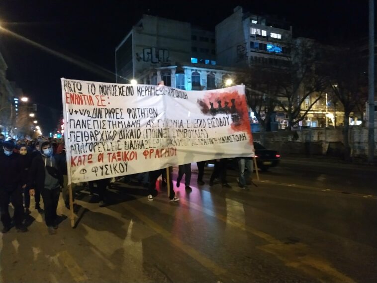 Το σώμα της πορείας διασπάστηκε στην Ίωνος Δραγούμη με τους φοιτητικούς συλλόγους και τους διαδηλωτές που πρόσκεινται στο ΜΑΣ και το ΠΑΜΕ να καταλήγουν στο Υπουργείο Μακεδονίας-Θράκης, ενώ φοιτητικοί σύλλοι και σχήματα του αναρχικού χώρου και της εξωκοινοβουλευτικής αριστεράς έστριψαν στην οδό Εγνατία.