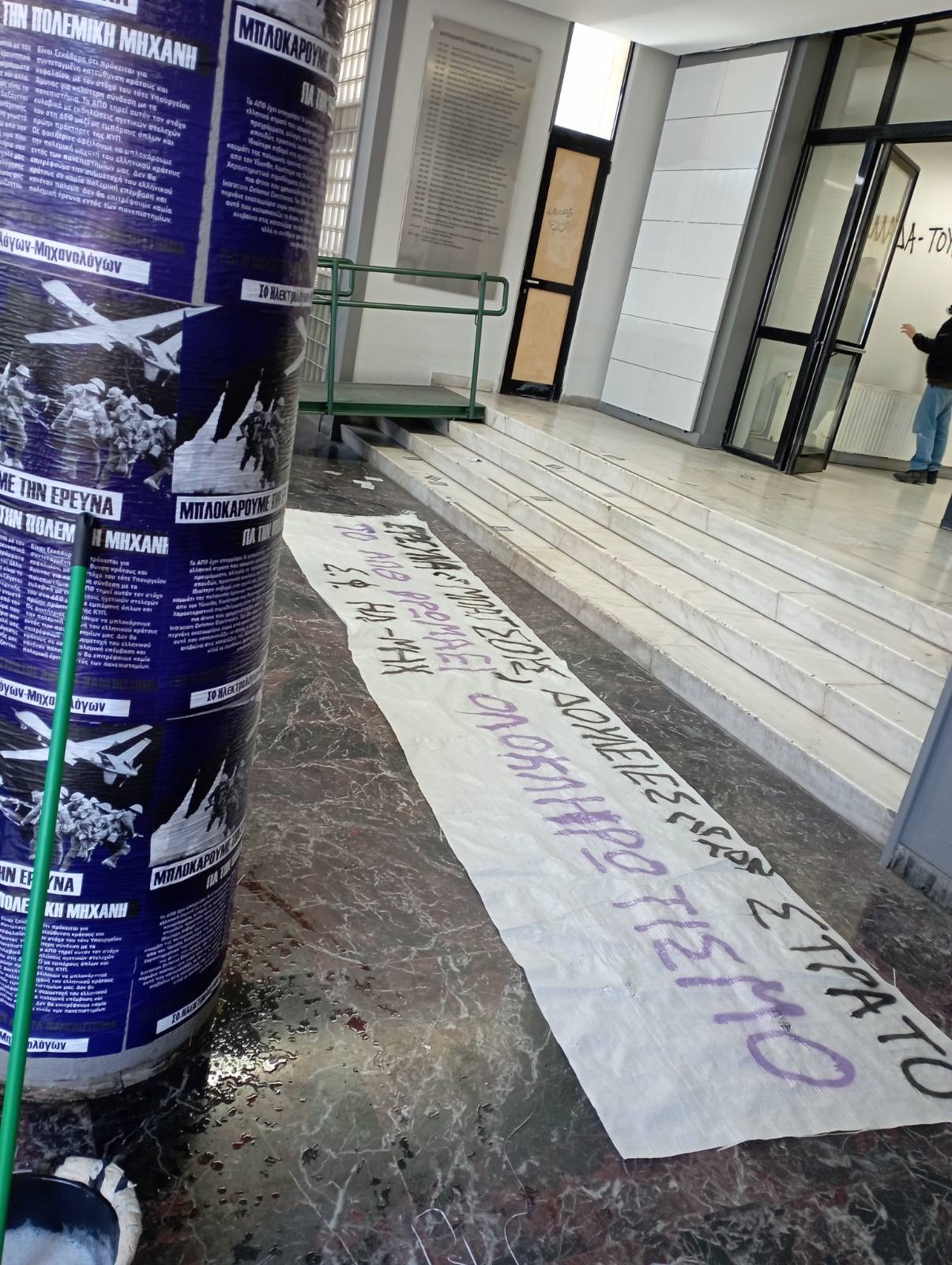Ως φοιτήτριες οφέιλουμε να μπλοκάρουμε την πολεμική μηχανή του ελληνικού κράτους εντός των πανεπιστημίων μας. Δεν θα επιτρέψουμε καμία πολεμική επέμβαση και κανέναν πόλεμο του ελληνικού κράτους. Αλληλεγγύη στις μετανάστριες.