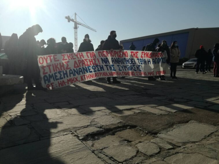 Παρά το έντονο κρύο αρκετές δεκάδες ήταν τα μέλη του νεοσύστατου σωματείου στο ΑΠΘ που έχοντας στο πλευρό τους πολλούς εργαζομένους στις εργολαβίες του ιδρύματος αλλά και μέλη φοιτητικών συλλόγων και συνδικάτων της Θεσσαλονίκης, πραγματοποίησαν σήμερα παράσταση διαμαρτυρίας στην πρυτανεία του ΑΠΘ διεκδικώντας την άμεση επαναπρόσληψη του προσωρινού προέδρου του σωματείου που απολύθηκε πρόσφατα.