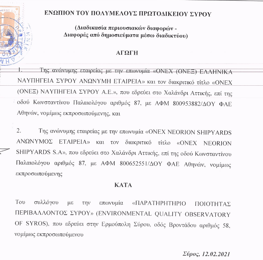 Αγωγή με την οποία απαιτεί 1.000.000 € για δυσφήμιση, ηθική βλάβη και διαφυγόντα κέρδη κατέθεσε η εταιρεία ONEX (ΟΝΕΞ) ΕΛΛΗΝΙΚΑ ΝΑΥΠΗΓΕΙΑ ΣΥΡΟΥ ΑΕ εναντίον του Παρατηρητηρίου Ποιότητας Περιβάλλοντος Σύρου (ΠΠΠΣ) εξαιτίας αιτήματος που κατέθεσε στον Υπουργό Περιβάλλοντος σχετικά με την στασιμότητα για πάνω από ένα χρόνο της υπόθεσης των βαρέων μετάλλων στο λιμάνι της Ερμούπολης.