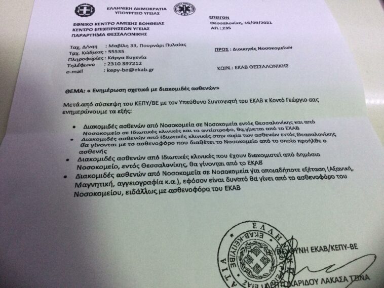 Όπως επεσήμανε ο Κ. Καρακατσιανόπουλος, πρώην πρόεδρος του ΕΚΑΒ μιλώντας στον ρ/σ Στο Κόκκινο Θεσσαλονίκης 91,4, η πρακτική που ακολουθείται είναι παράνομη, καθώς οι ιδιωτικές κλινικές είναι υποχρεωμένες να κάνουν αυτές την μεταφορά των ασθενών. Παρ’ όλα αυτά τις τελευταίες ημέρες υπήρξε έγγραφο του ΕΚΑΒ Θεσσαλονίκης που δίνει οδηγία οι μεταφορές από και προς τις ιδιωτικές κλινικές να γίνονται από το ΕΚΑΒ.