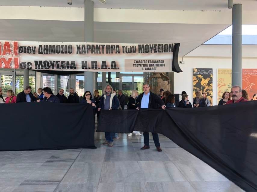 Υψώνοντας μαύρα πανιά εργαζόμενοι στο Υπουργείο Πολιτισμού Β. Ελλάδος διαμαρτυρήθηκαν σήμερα στο αρχαιολογικού μουσείου ενάντια στον νόμο 5021/2023 που μετατρέπει τα πέντε μεγάλα μουσεία της χώρας σε ΝΠΔΔ. Τόσο ο Σύλλογος Υπαλλήλων στο ΥΠΠΟ Β. Ελλάδος όσο και ο Σύλλογος Ελλήνων Αρχαιολόγων καταγγέλλουν την Υπουργό Πολιτισμού Λ. Μενδώνη που την Μ. Πέμπτη ανακοίνωσε αιφνιδίως με δελτίο Τύπου τον διορισμό των Διοικητικών Συμβουλίων και των Γενικών Διευθυντών των πέντε μουσείων και δηλώνουν ότι θα αγωνιστούν για την κατάργηση του νόμου και την επαναφορά των μουσείων υπό την σκέπη του Υπουργείου Πολιτισμού.