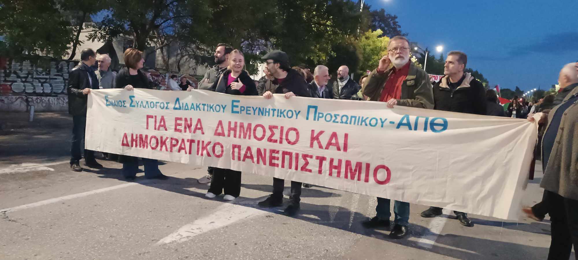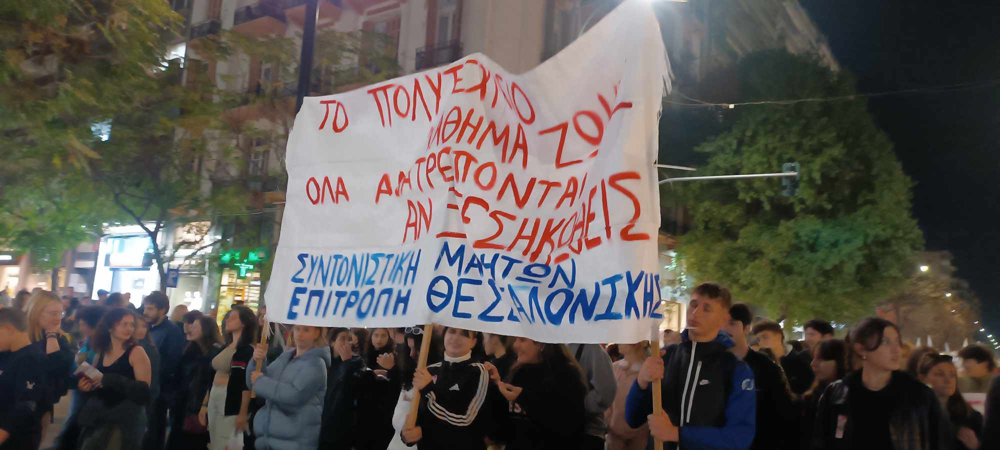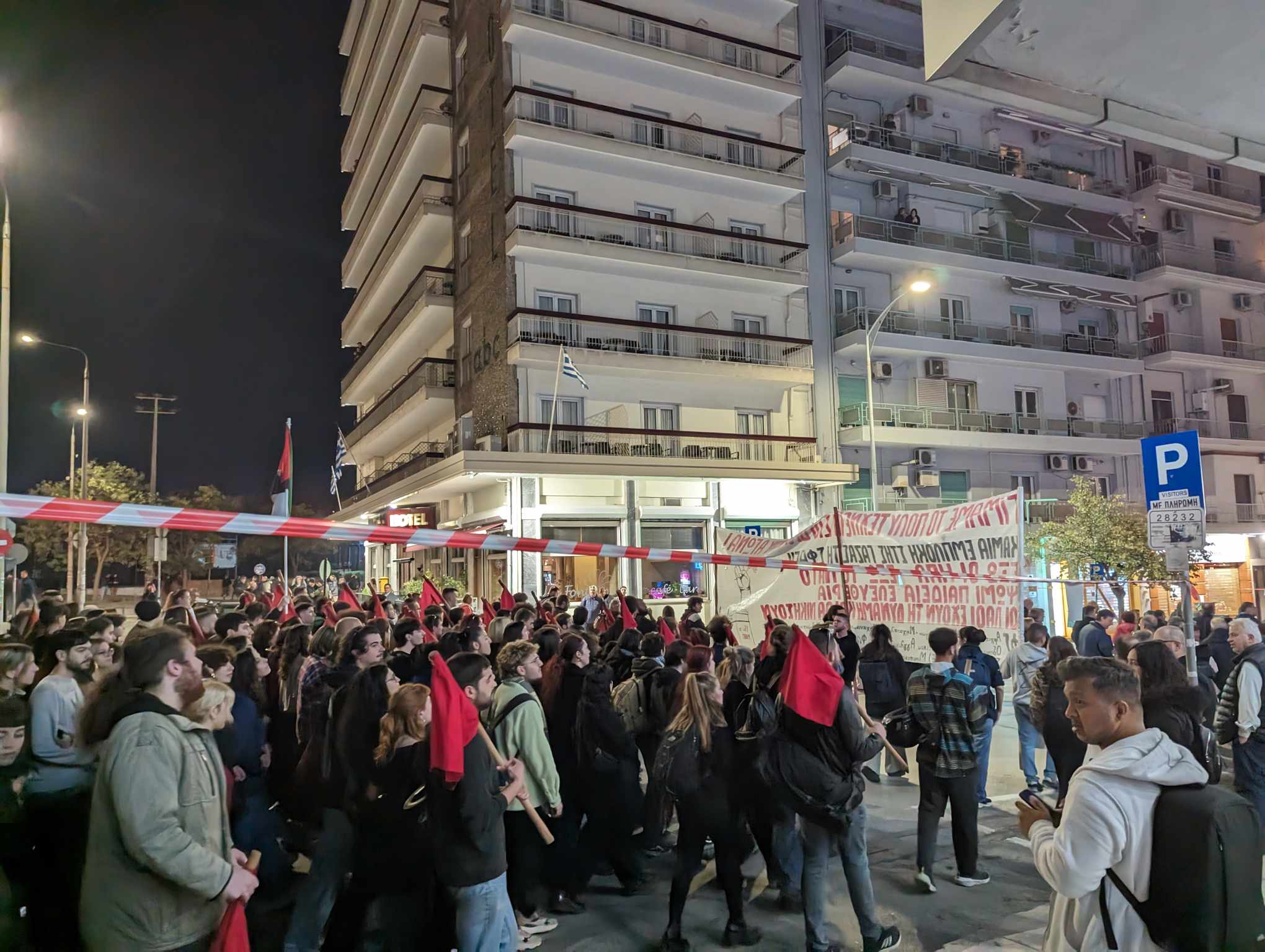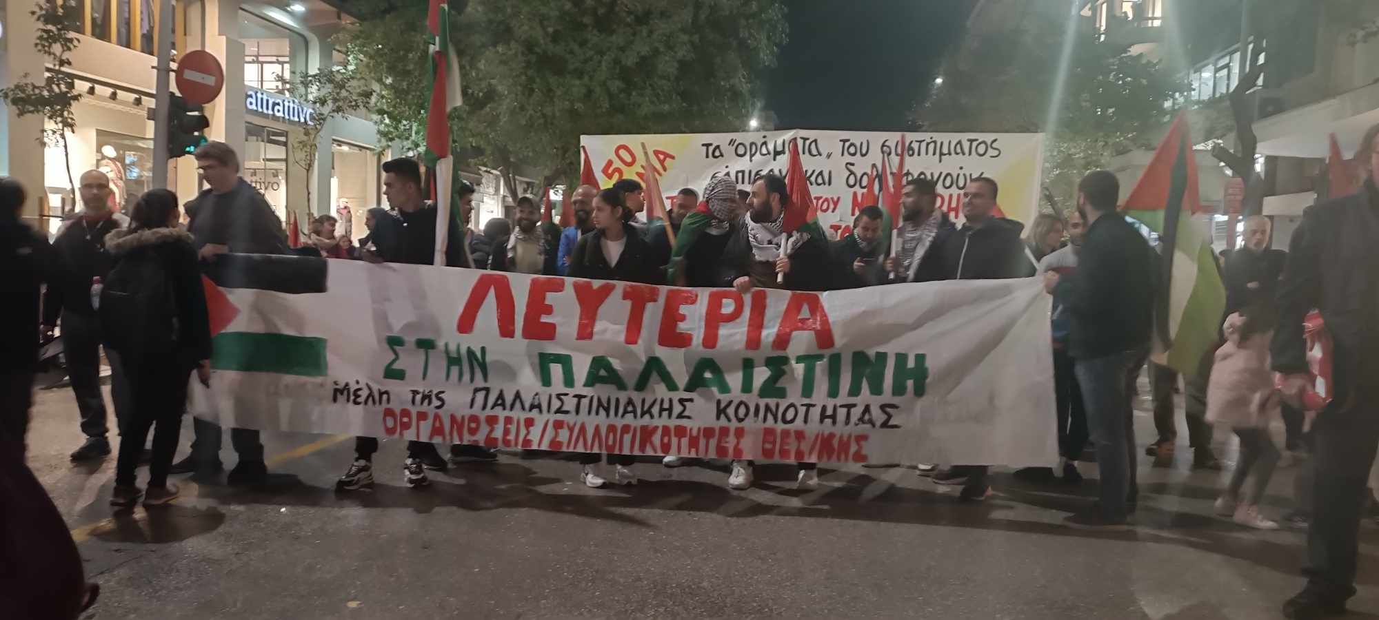 Μια από τις πιο μαζικές διαδηλώσεις πραγματοποιήθηκε χθες στη Θεσσαλονίκη για την επέτειο μνήμης της εξέγερσης του Πολυτεχνείου και τιμής σε όσες-ους αντιστάθηκαν στην Χούντα των Συνταγματαρχών. Φοιτητικοί σύλλογοι που είχαν συγκεντρωθεί από νωρίς το πρωί στην είσοδο της Πολυτεχνικής του ΑΠΘ, σωματεία, εκπαιδευτικοί σύλλογοι, πολιτικές οργανώσεις και συλλογικότητες της αριστεράς και του αντιεξουσιαστικού χώρου διαδήλωσαν από κοινού με μέλη της Παλαιστινιακής κοινότητας κρατώντας γαρύφαλλα και παλαιστινιακές σημαίες.