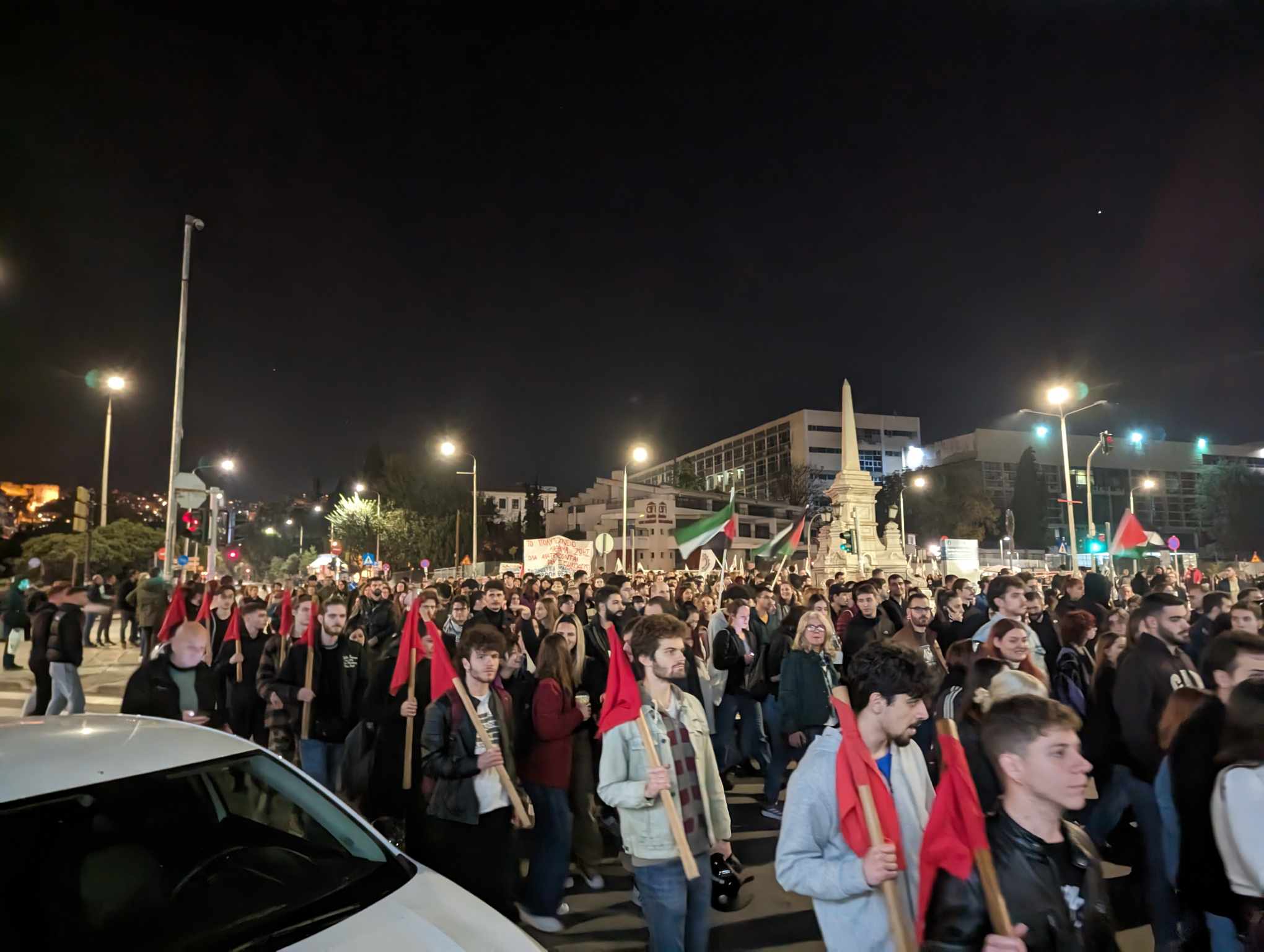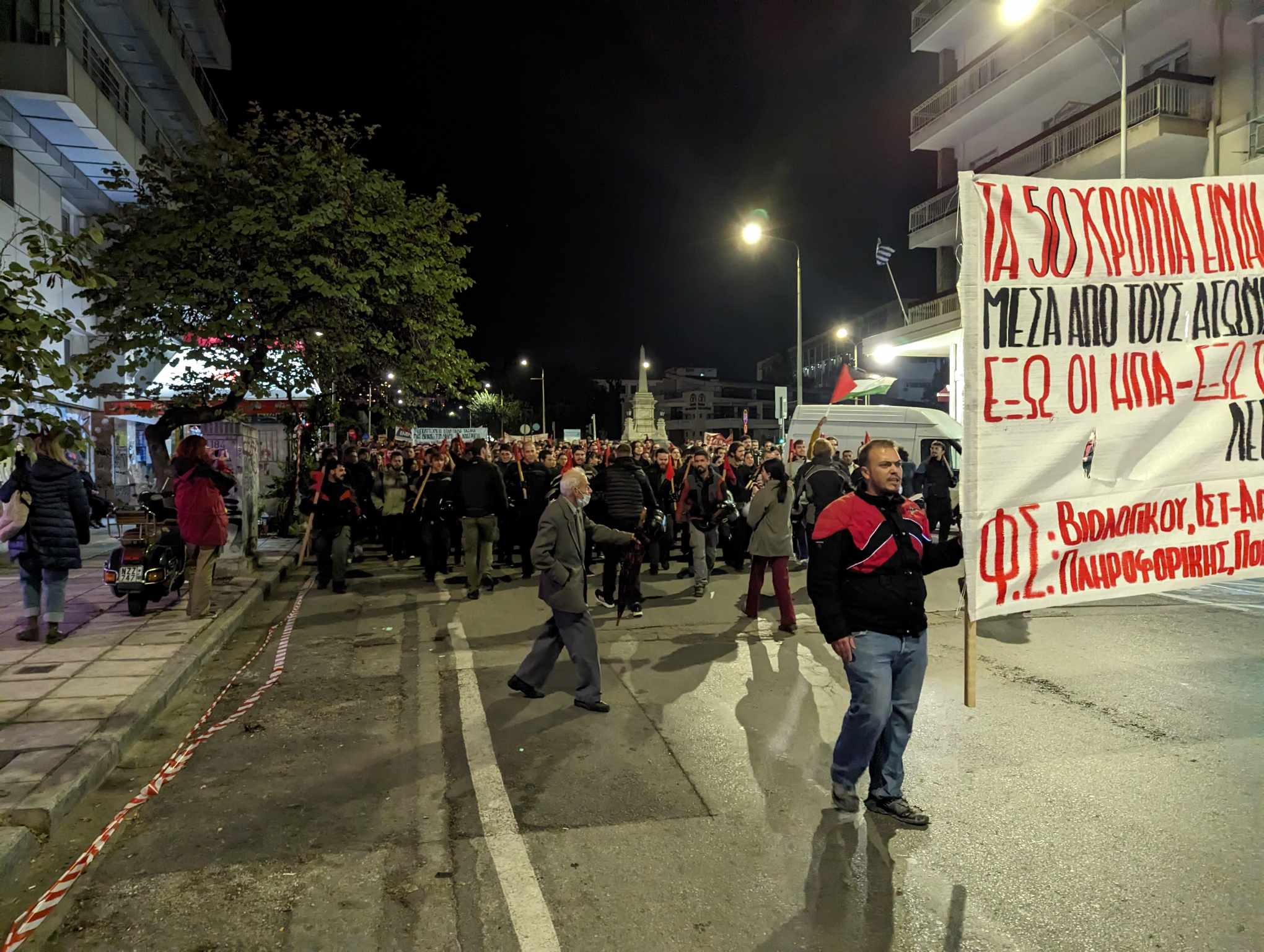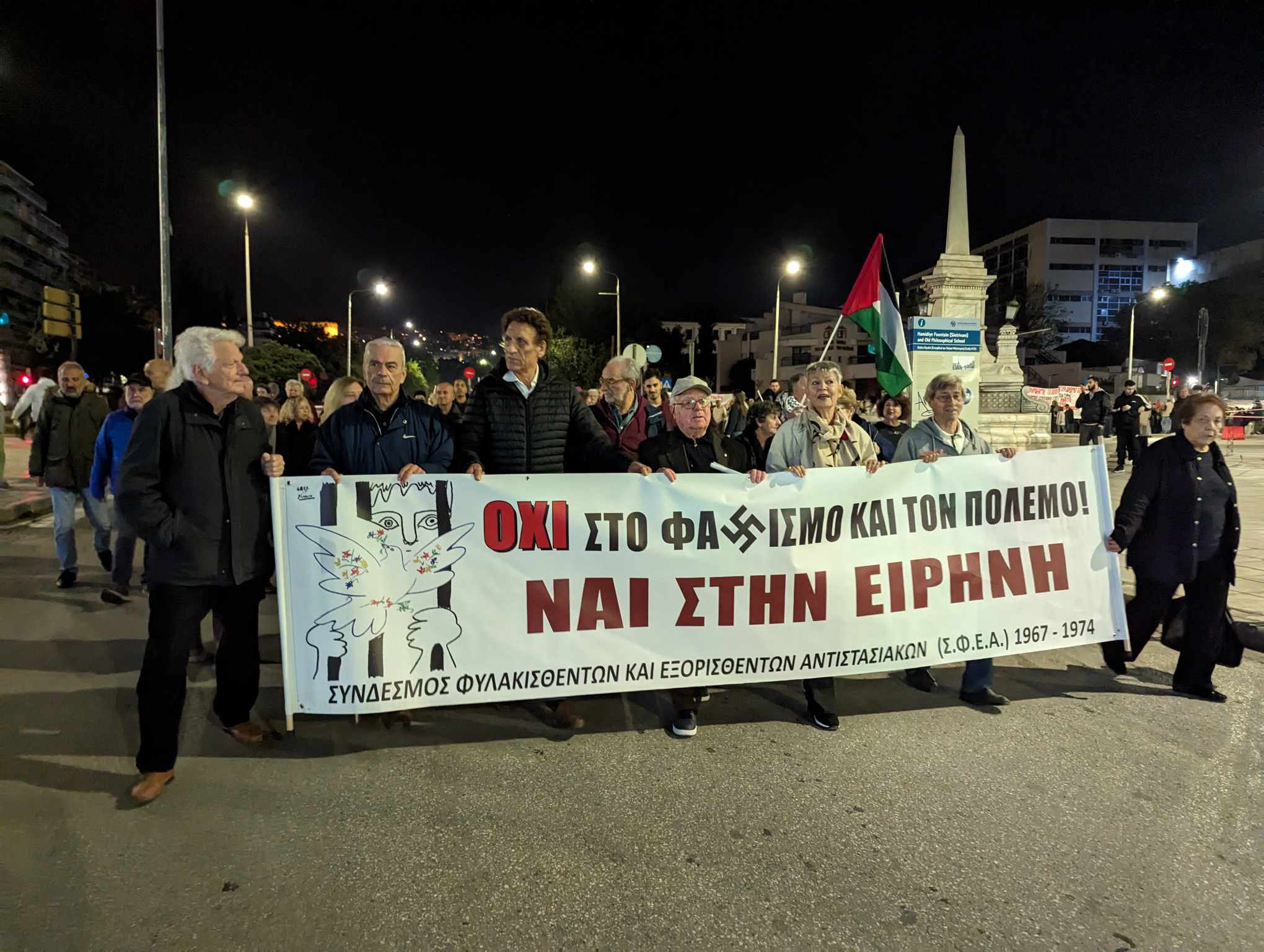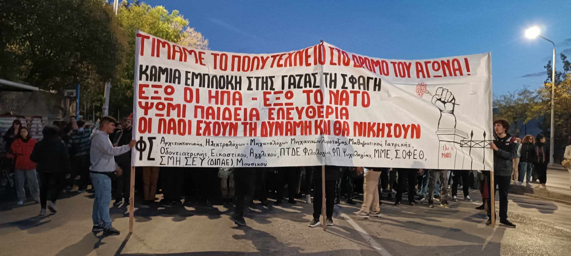 Η διαδήλωση ξεκίνησε το απόγευμα με τον Σύνδεσμο Φυλακισθέντων Εξορισθέντων Αντιστασιακών 1967-1973 να τοποθετείται στην κεφαλή της πορείας. Κυρίαρχα ήταν τα συνθήματα και τα πλακάτ που ζητούσαν να σταματήσει η σφαγή στην Γάζα ενώ σε όλα τα πανό αναγράφονταν αντιπολεμικά και αντιφασιστικά συνθήματα. Η αλληλεγγύη στον Παλαιστινιακό λαό ήταν το κυρίαρχο αίτημα και αυτό που συνέδεε τον αγώνα ενάντια στην Χούντα των Συνταγματαρχών με τους σημερινούς αγώνες για «Ψωμί-Παιδεία-Ελευθερία». Φοιτητικοί σύλλογοι ζητούν την απεμπλοκή της χώρας μας από το ΝΑΤΟ και την πολεμική μηχανή αλλά και έναν κόσμο ισότητας και δικαιοσύνης που όλες οι ζωές να μετράνε.