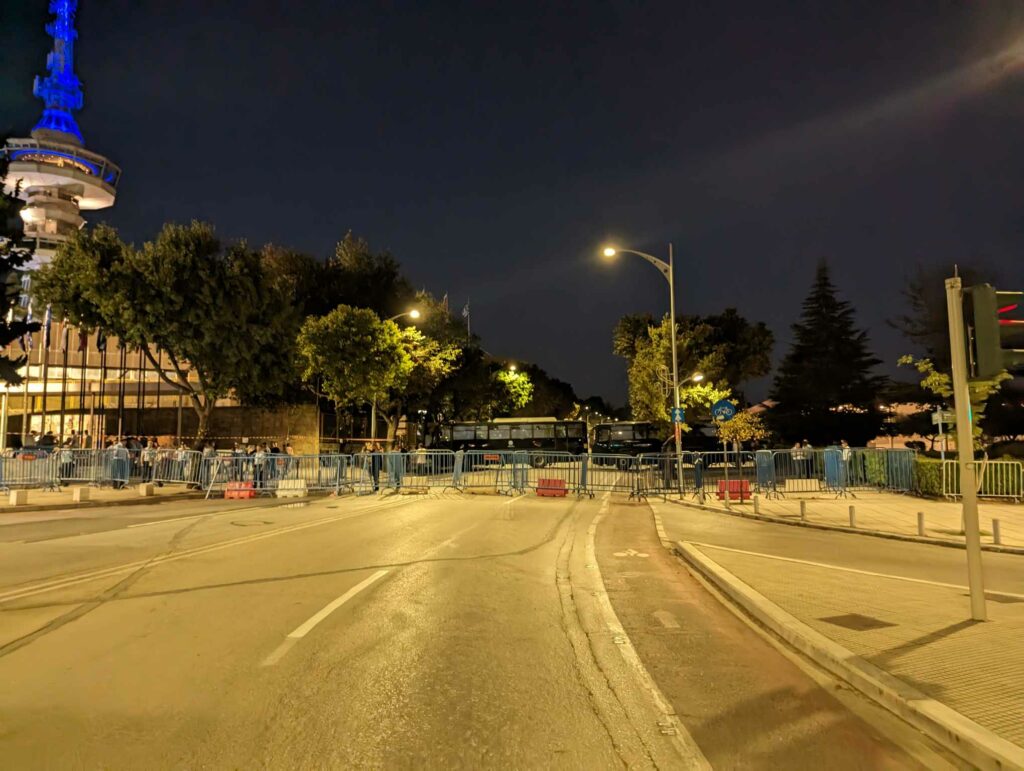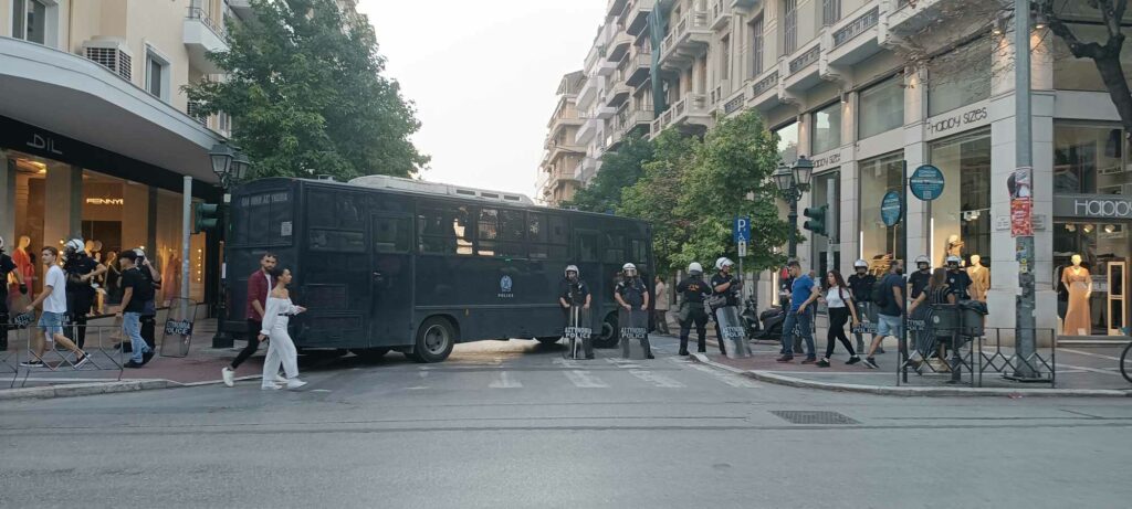 Παρά την απουσία του πρωθυπουργού και της κυβέρνησης, οι κεντρικοί δρόμοι της Θεσσαλονίκης κατακλείστηκαν από ισχυρές αστυνομικές δυνάμεις και κλούβες των ΜΑΤ. Δεκάδες κλούβες των ΜΑΤ παρατάχθηκαν έξω από το Συνεδριακό Κέντρο Ιωάννης Βελλίδης, για να προστατέψουν ένα άδειο κτίριο από τους διαδηλωτές.