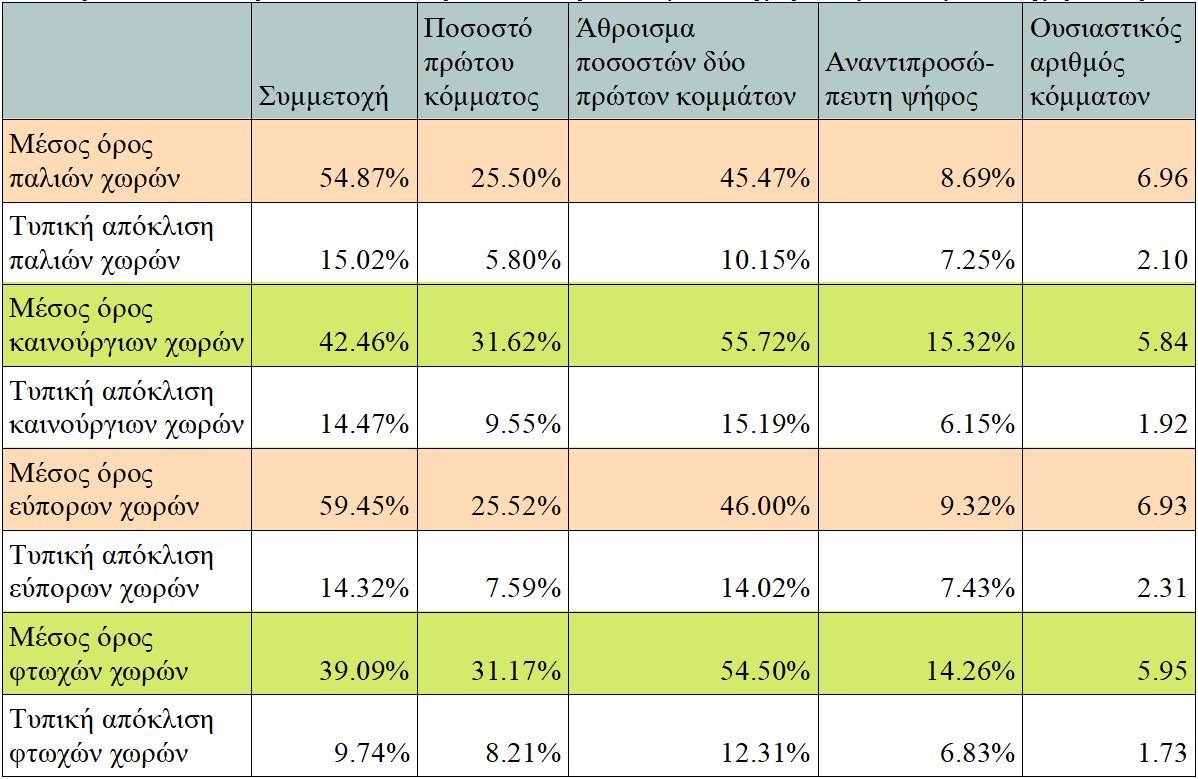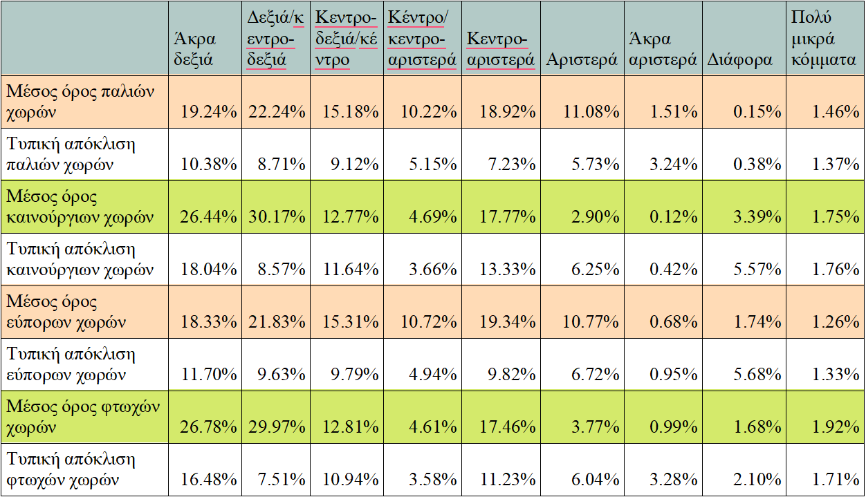 Ενώ, λοιπόν, ο μέσος όρος του αθροίσματος των ακροδεξιών και των δεξιών-κεντροδεξιών είναι παντού υψηλός και οι συγκεκριμένες πολιτικές τοποθετήσεις καταλαμβάνουν τις δύο πρώτες θέσεις, είναι σαφώς πιο ισχυρές στις καινούργιες και φτωχές χώρες. Έτσι, για τα δεξιά-κεντροδεξιά κόμματα ο μέσος όρος στις καινούργιες και φτωχές όρος είναι γύρω στο 30%, ενώ στις παλιές κι εύπορες περίπου 22% (διαφορά οκτώ μονάδων) και για τα ακροδεξιά έχουμε αντίστοιχα 26,5% για τις καινούργιες και φτωχές χώρες και σχεδόν 19% για παλιές κι εύπορες (χοντρικά ίδια διαφορά μονάδων). Στην τρίτη θέση σε όλες τις περιπτώσεις έχουμε τα κεντροαριστερά (σοσιαλδημοκρατικά) κόμματα και, μάλιστα, με σχετική ισοκατανομή, αφού στις παλιές κι εύπορες χώρες είναι στο 19% και στις καινούργιες και φτωχές στο 17,5% (διαφορά μιάμισης μονάδας). Τα πράγματα αλλάζουν περισσότερο στον χώρο της κεντροδεξιάς-κέντρου (φιλελεύθερα κόμματα), ο οποίος στις παλιές κι εύπορες χώρες κινείται πάνω από το 15% και στις καινούργιες και φτωχές κάτω από το 13% (διαφορά περίπου δυόμιση μονάδων). Πολύ πιο σημαντικές είναι οι διαφορές στον χώρο του κέντρου-κεντροαριστεράς (πράσινα κόμματα και σύμμαχοί τους) όπου έχουμε για τις μεν παλιές κι εύπορες χώρες μέσους όρους του 10,5% και για τις καινούργιες και φτωχές του 4,5% (έξι μονάδες διαφορά), ενώ η αριστερά κινείται στις παλιές κι εύπορες χώρες στο 11% και στις καινούργιες και φτωχές κάπου στο 3,5% (διαφορά επτάμιση μονάδων). Οι υπόλοιπες τοποθετήσεις έχουν γενικά πολύ μικρά ποσοστά, οπότε ενίοτε επηρεάζονται εύκολα από τα ποσοστά ενός και μόνο συνδυασμού. Δηλαδή, το ότι για τα ακροαριστερά κόμματα έχουμε υψηλότερο μέσο όρο στις παλιές και στις φτωχές χώρες αντίστοιχα οφείλεται στην Ελλάδα (που ανήκει σ’ αυτές τις κατηγορίες) και πιο πολύ στο ποσοστό του ΚΚΕ, ενώ αντίστοιχα το ότι ο μέσος όρος των διαφόρων κόμματα είναι μεγαλύτερος στις καινούργιες και στις εύπορες χώρες είναι αποτέλεσμα του ποσοστού του Φειδία στην Κύπρο. Τέλος, στο άθροισμα των πολύ μικρών κομμάτων (κάτω του 0,45%) βλέπουμε μια μικρή υπεροχή στις καινούργιες και φτωχές χώρες.