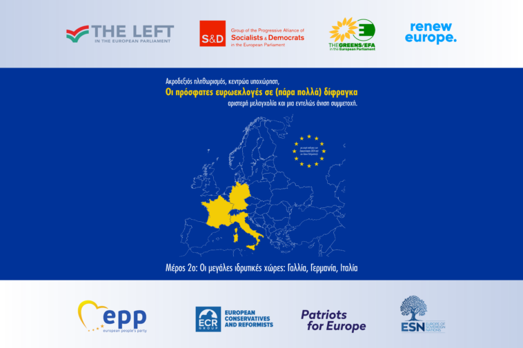 Όσον αφορά στους πολιτικούς χώρους έχουμε ακροδεξιά κόμματα να πρωτεύουν σε Ιταλία και Γαλλία, στη δεύτερη μάλιστα με εντυπωσιακό τρόπο αφού το ποσοστό της Εθνικής Συσπείρωσης είναι υπερδιπλάσιο του δεύτερου κόμματος, ενώ είναι πρώτη σε όλες τις περιφέρειες της μητροπολιτικής Γαλλίας (και σε κάποιες υπερπόντιες) και μόνο σε επίπεδο διοικητικών διαμερισμάτων (νομών) χάνει τα διαμερίσματα του Παρισιού όπου επικρατούν είτε το κόμμα του Μακρόν, είτε του Μελανσόν, είτε το Σοσιαλιστικό. Επιπλέον, υπάρχουν και μικρότερα ακροδεξιά κόμματα και στις δύο αυτές χώρες. Μαζί με το 31,37% της Λεπέν (30 έδρες, επτά περισσότερες) έχουμε το 5,47% της Περήφανης Γαλλίας (με “βασικό μέτοχο” την Ανάκτηση! του Ε. Ζεμμούρ), που εκλέγει πέντε ευρωβουλευτές, ένας εκ των οποίων εντάσσεται στην ESN κι οι υπόλοιποι τέσσερις (που όπως αναφέραμε διαφώνησαν με τον αρχηγό τους για τη στάση του κόμματος στις εθνικές εκλογές) στους ECR, ενώ υπάρχει κι η μια σχεδόν μονάδα (χωρίς έδρα) του συνασπισμού Αρκετά με την Ευρώπη, όπου συμμετέχουν Οι Πατριώτες, επικεφαλής των οποίων είναι ένας πρώην αντιπρόεδρος του Εθνικού Μετώπου. Στην Ιταλία στο πλάι του κόμματος της Μελόνι, που έφθασε το 28,75% (τετραπλασιάζοντας τις έδρες του σε 24), έχουμε τη συγκυβερνώσα Λέγκα του Σαλβίνι με 8,97% κι οκτώ ευρωβουλευτές, που χάνει όμως 21 έδρες (η κατάσταση μοιάζει με “τράμπα” ψηφοφόρων μεταξύ των δύο κομμάτων). Η Εναλλακτική για τη Γερμανία ήρθε δεύτερη στη χώρα (15,90%) εκλέγοντας 15 ευρωβουλευτές (τέσσερις περισσότερους). Σε επίπεδο κρατιδίων κέρδισε σε όλα τα ανατολικά (εκτός Βερολίνου) με ποσοστά πάνω ή κοντά στο 30% (σχεδόν διπλάσια του εθνικού της ποσοστού). Βλέποντας τον χάρτη των αποτελεσμάτων σου δημιουργείται η εντύπωση ότι “αναστήθηκε” η Ανατολική Γερμανία. Το κόμμα έχει περάσει απ’ όλες τις ακροδεξιές ομάδες του Ευρωκοινοβουλίου, ξεκινώντας από τους ECR, πηγαίνοντας στην EFDD (Ευρώπη της Ελευθερίας και της Άμεσης Δημοκρατίας, όπου βασικό ήταν το κόμμα του Φάρατζ από το Ηνωμένο Βασίλειο) και καταλήγοντας στην ID, από όπου “εκδιώχτηκε” πριν τις εκλογές με πρωτοβουλία της Λεπέν κι έτσι βρέθηκε στους Μη Ενταγμένους (ΝΙ) για να αποτελέσει τώρα τον βασικό κορμό της νεοϊδρυθείσας Ευρώπης των Κυρίαρχων Εθνών (ESN).