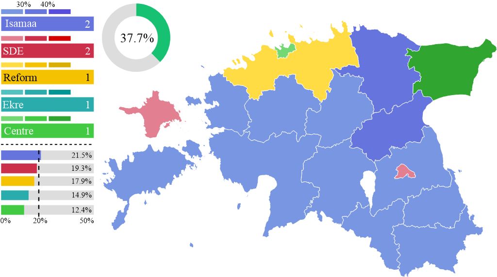 | Κόμμα Πατρίδας (Isamaa) | 21,50% | 2 | EPP |