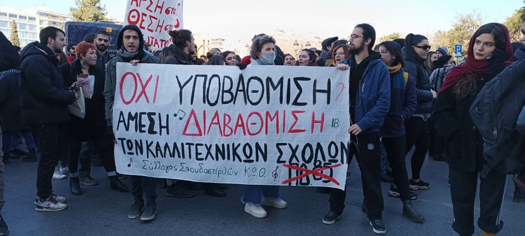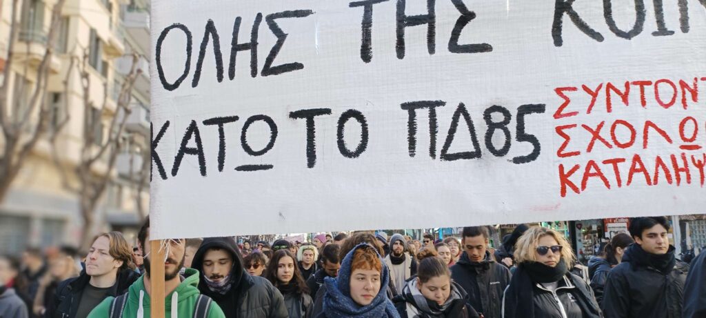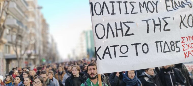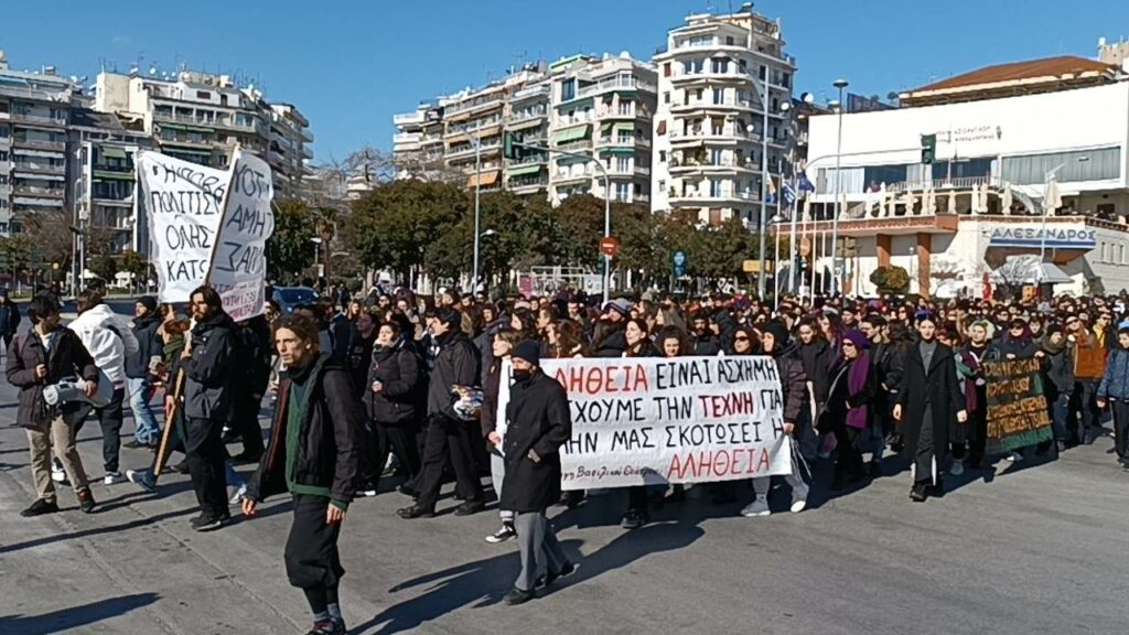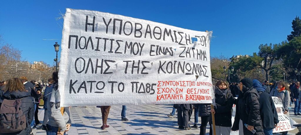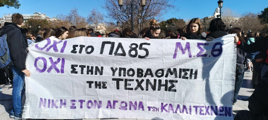 Με μια μαζική πορεία σπουδαστές/στριες των δραματικών σχολών, καθηγητές-τριες στο Χώρο του Χορού, ο Σύλλογος Μουσικών Βορείου Ελλάδος, ο Σύλλογος των σπουδαστ(ρι)ών του Κρατικού Ωδείου Θεσσαλονίκης και μαθητές-τριες των καλλιτεχνικών σχολείων κλιμακώνουν τον αγώνα τους με αίτημα να αποσυρθεί το Προεδρικό Διάταγμα 85 που υποβαθμίζει τα σπουδαστικά και επαγγελματικά τους δικαιώματα. Ο καλλιτεχνικός κόσμος της Θεσσαλονίκης δηλώνει ανυποχώρητος και ενωμένος απέναντι στην επίθεση που δέχεται από την κυβέρνηση και στην υποβάθμιση του πολιτισμού, που όπως υποστηρίζει είναι ζήτημα όλης της κοινωνίας.