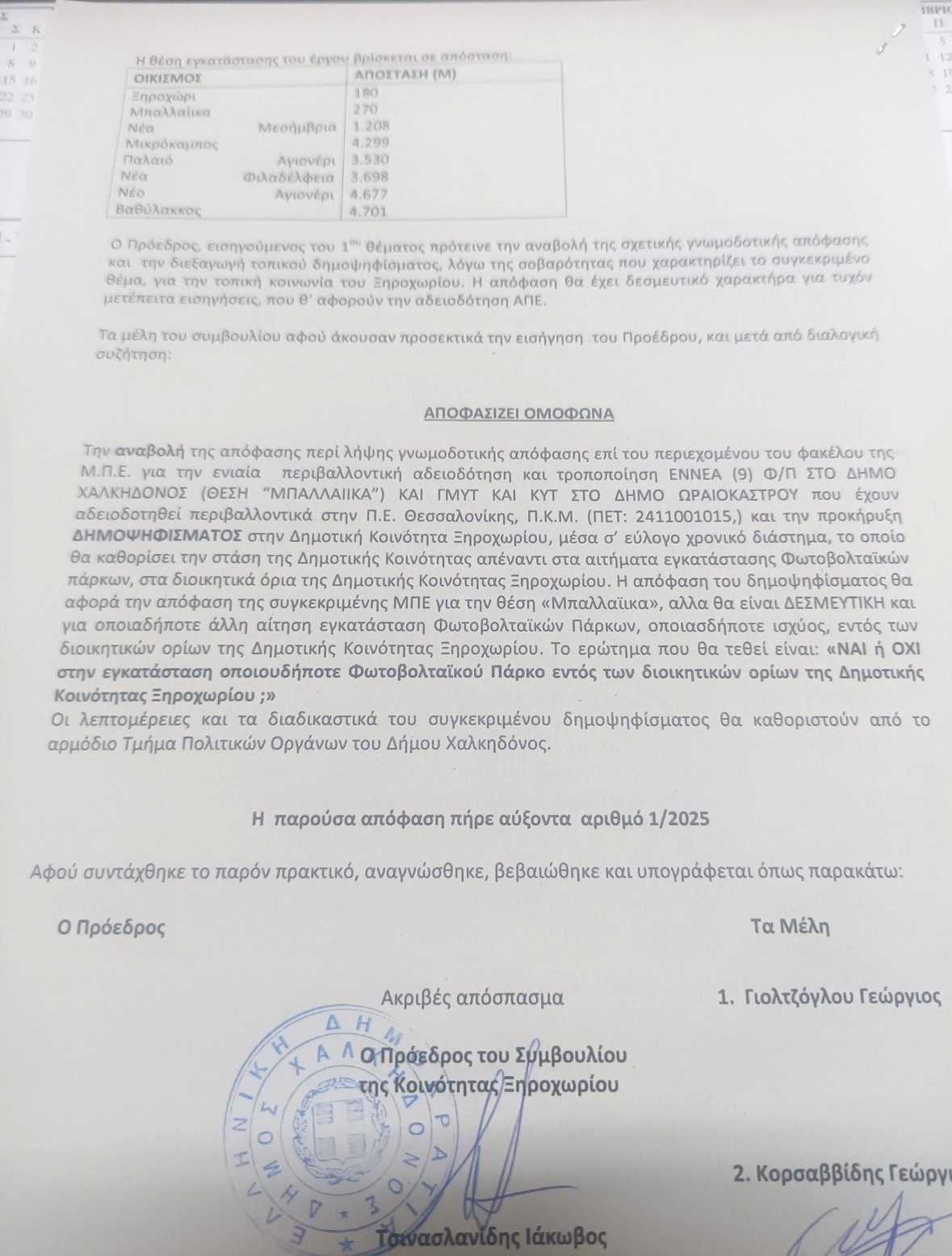 Ουσιαστικά, όπως εξηγεί ο κ. Κωνσταντινίδης, ήταν μια απόφαση του προέδρου του δημοτικού συμβουλίου προκειμένου να οδηγήσει το κοινοτικό συμβούλιο σε μια θετική γνωμοδότηση, η οποία στη συνέχει θα μεταφερθεί στο δημοτικό συμβούλιο και θα επηρεάσει τη δική του γνωμοδότηση. Το αίτημα για δημοψήφισμα με το ερώτημα «Ναι ή όχι σε οποιοδήποτε φωτοβολταϊκό» κατατέθηκε από τον πρόεδρο του κοινοτικού συμβουλίου και συμφώνησαν οι δύο από τους τρεις κοινοτικούς σύμβουλους. «Ήταν μια συνεδρίαση με μεγάλη ένταση εξαιτίας της σοβαρότητας του θέματος και εκεί μεθοδεύτηκε η εξέλιξη να πάμε σε ένα δημοψήφισμα, ενώ από πλευράς των κατοίκων που πούλησαν τα χωράφια τους το μοναδικό επιχείρημα είναι πως θα κάνουμε ό,τι θέλουμε με τα χωράφια μας. Φυσικά, αυτό είναι ένα έωλο επιχείρημα καθώς η αλήθεια είναι ότι δεν μπορεί ο καθένας να κάνει ό,τι θέλει με το χωράφι του. Παράλληλα, το ερώτημα είναι εκβιαστικό καθώς δεν είναι ένα ερώτημα που αφορά το συγκεκριμένο φωτοβολταϊκό, αλλά είναι ένα ερώτημα σχετικά με οποιοδήποτε φωτοβολταϊκό. Δημιουργεί σύγχυση αφού είναι αδύνατο να πει κανείς “ΟΧΙ” ακόμη και για μικρές εγκαταστάσεις, όπως δύο πάνελ στη στέγη ενός σπιτιού».
