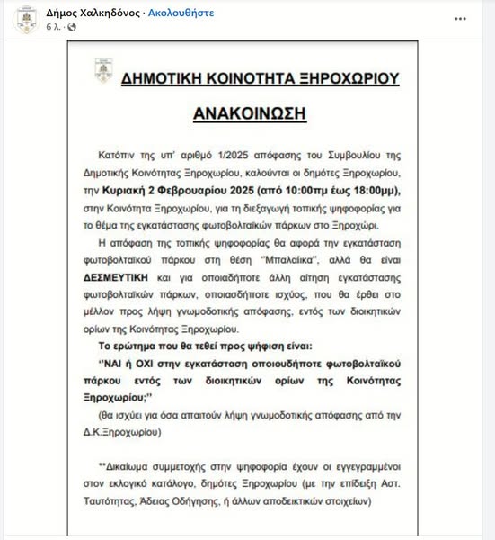 Upd: Μετά τις αντιδράσεις των κατοίκων ο πρόεδρος του τοπικού συμβουλίου Ξηροχωρίου Τσινασλανίδης Ιάκωβος ακύρωσε το δημοψήφισμα ανακοινώνοντας ότι το τοπικό συμβούλιο θα συνεδριάσει και θα γνωμοδοτήσει για την Μ.Π.Ε, στην τοποθεσία Μπαλαιΐκα.