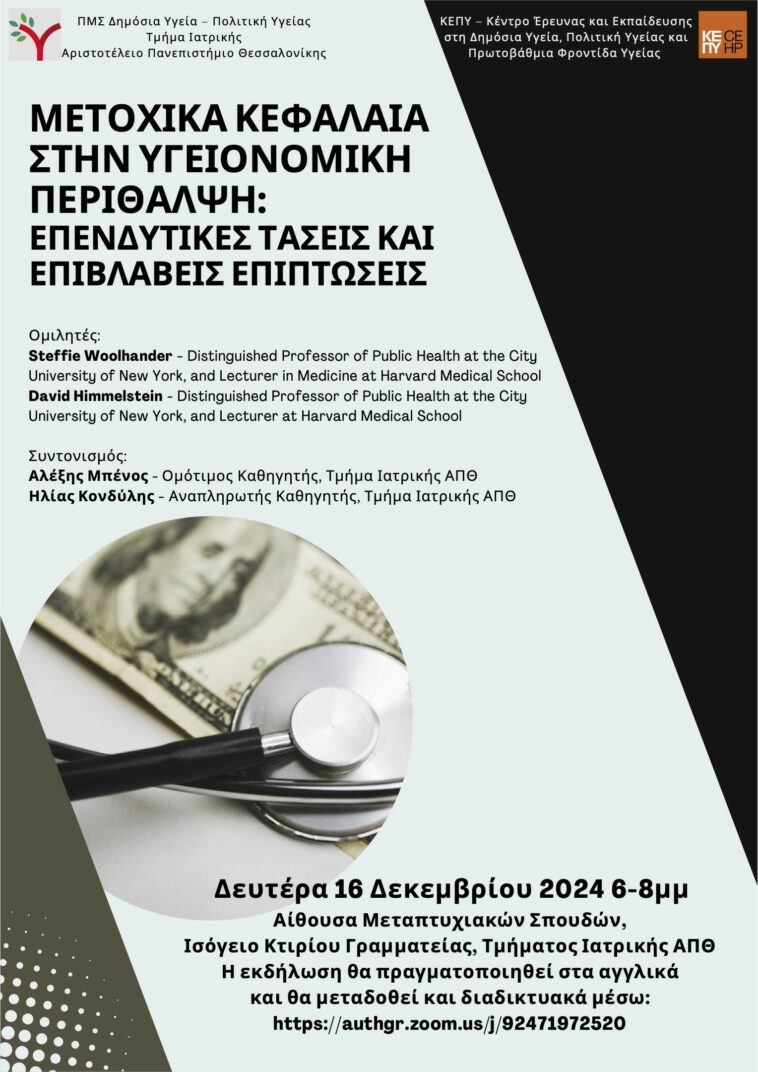 Ανοικτή εκδήλωση του συνδιοργανώνουν το ΠΜΣ “Δημόσια Υγεία – Πολιτική Υγείας” του Τμήματος Ιατρικής ΑΠΘ και το ΚΕΠΥ (Κέντρο Έρευνας και Εκπαίδευσης στη Δημόσια Υγεία, Πολιτική Υγείας και ΠΦΥ) με θέμα “Private Equity in Healthcare: investment trends and harmful effects”.