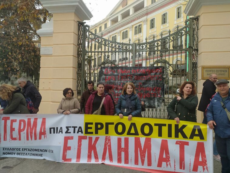 Συγκέντρωση διαμαρτυρίας έξω από το υπουργείο Μακεδονίας-Θράκης πραγματοποίησαν το πρωί της Τρίτης οι εργαζόμενοι του τομέα καθαριότητας των δήμων του νομού Θεσσαλονίκης, στο πλαίσιο της 24ωρης απεργίας που έχει προκηρύξει η ΠΟΕ-ΟΤΑ. Οι εργαζόμενοι καταγγέλλουν κυβέρνηση και δημάρχους για την αύξηση των εργατικών ατυχημάτων και δυστυχημάτων των εργαζόμενων του τομέα καθαριότητας, καθώς και για τη μη παροχή Μέσων Ατομικής Προστασίας στη συντριπτική πλειοψηφία των δήμων.