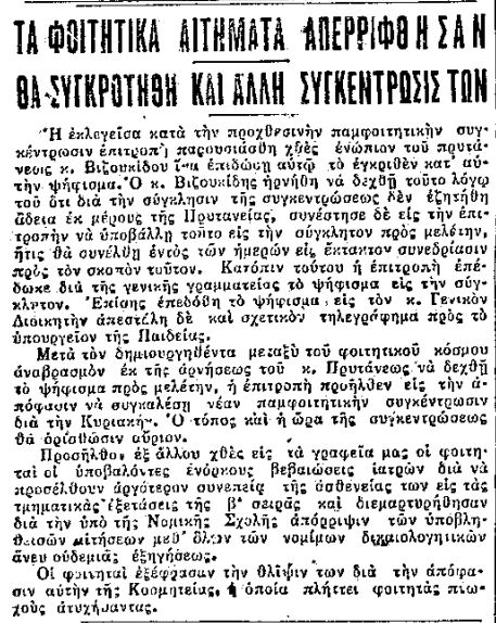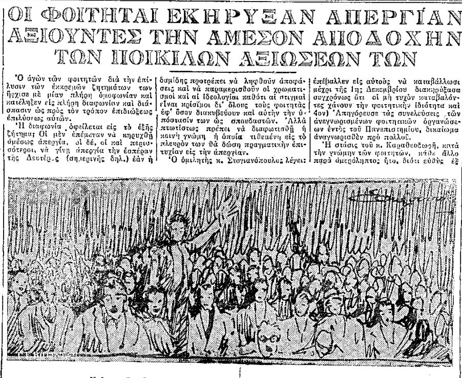 Ήταν το Νοέμβριο του 1931 όταν οι φοιτητές στη Θεσσαλονίκη είχαν κηρύξει πολυήμερη παμφοιτητική απεργία διεκδικώντας τη βελτίωση των συνθηκών εκπαίδευσης στο ΑΠΘ, δεδομένου ότι τα εργαστήρια, οι βιβλιοθήκες και οι κλινικές βρίσκονταν σε κακά χάλια και έλειπαν και τα στοιχειώδη μέσα για την καλή λειτουργία τους. Επίσης ζητούσαν τη δωρεάν σίτιση στη φοιτητική λέσχη των φτωχών φοιτητών και των πρωτοετών, την πλήρη ελευθερία του “συνέρχεσθαι” των φοιτητών και την κατάπαυση της τρομοκρατίας από τις πανεπιστημιακές και αστυνομικές αρχές.