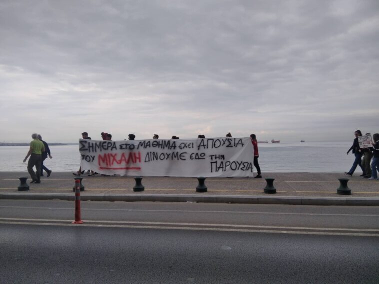 Σήμερα οι συμμαθητές και οι συμμαθήτριες του Μιχάλη συγκεντρώθηκαν στην προβλήτα Α’ του ΟΛΘ και από το σημείο αυτό μαζί με τον διευθυντή του Λυκείου και καθηγητές-τριες του σχολείου πραγματοποίησαν μια διαδήλωση από το πεζοδρόμιο μέχρι το Μέγαρο Μουσικής με συνθήματα: «Σήμερα το μάθημα έχει απουσία, του Μιχάλη δίνουμε εδώ την παρουσία», «Όχι άλλα άδεια θρανία», «Πρόσεξε την πινακίδα, γιατί είναι του πεζού η ασπίδα».
