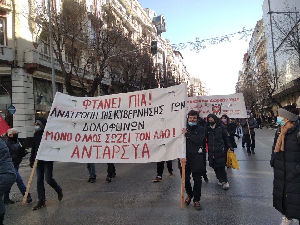 Συνθήματα όπως «Όχι στου θανάτου την πολιτική, ενισχύστε όλοι το ΕΣΥ», «Στη μνήμη των θυμάτων της πανδημίας, αξίζει η εξέγερση της κοινωνίας», μαζί με το αίτημα του Κοινωνικού Ιατρείου Αλληλεγγύης και δεκάδων άλλων συλλογικοτήτων να ανοίξει το εγκαταλελειμμένο -εδώ και οχτώ χρόνια- «Λοιμωδών», ηχούσαν δυνατά από τα μπλοκ των διαδηλωτών-τριών που παρά το κρύο κατέβηκαν στο δρόμο υπενθυμίζοντας τα τραγικά αποτελέσματα της κρατικής διαχείρισης της πανδημίας.