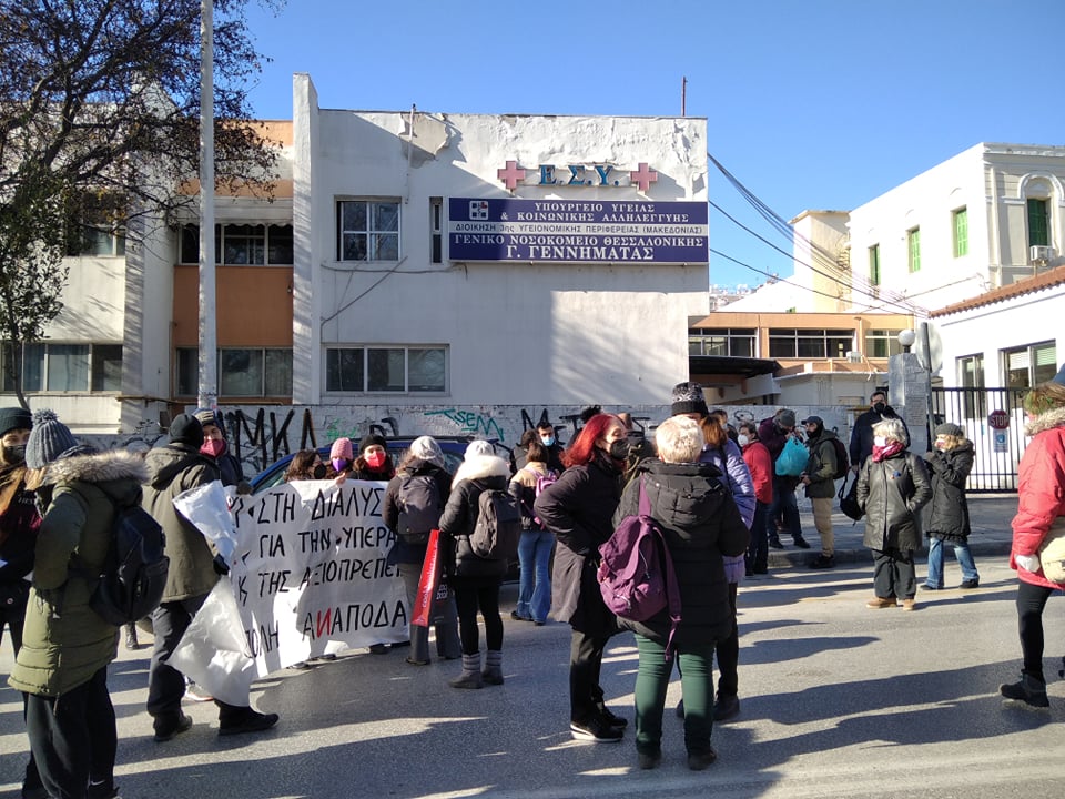 Η πορεία που ξεκίνησε από το άγαλμα Βενιζέλου κατέληξε στο νοσοκομείο Γεννηματάς, ένα νοσοκομείο που, όπως και τα περισσότερα στην πόλη, έχει μετατραπεί σε νοσοκομείο μιας νόσου. Αποτέλεσμα της απουσίας ενίσχυσης του ΕΣΥ είναι ασθενείς να περιμένουν σε λίστες αναμονής για μία κλίνη, απλή ή ΜΕΘ, ένα χειρουργείο ή μια απλή εξέταση.
